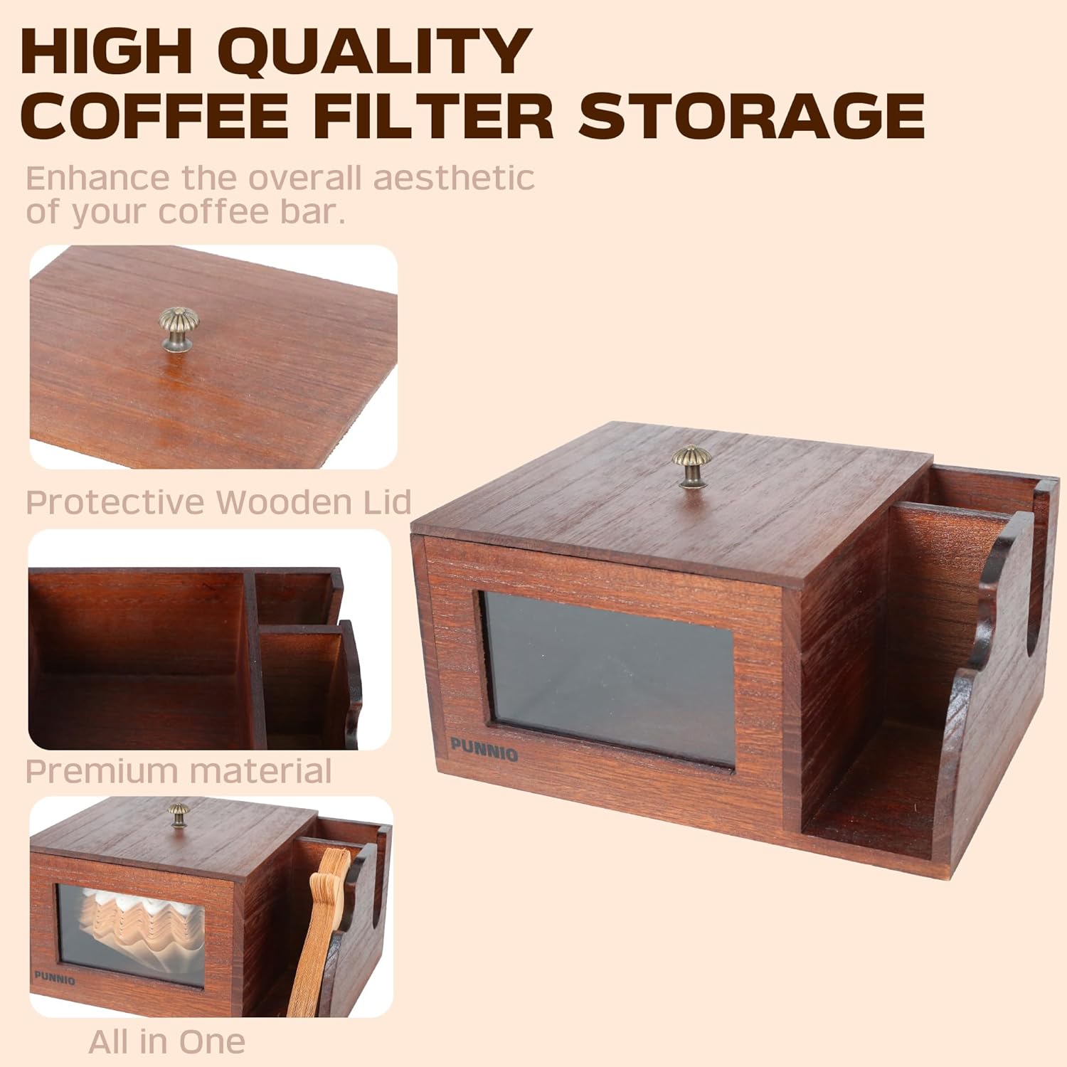- Made of Solid Wood: Crafted from high-quality solid wood, our coffee filter holder is durable and built to last. It resists breaking and deformation, ensuring long-lasting use. The smooth interior and surface make cleaning effortless—just wipe with a damp cloth. The thoughtful lid design keeps your coffee filters safe from dust, ensuring optimal preservation for years to come.