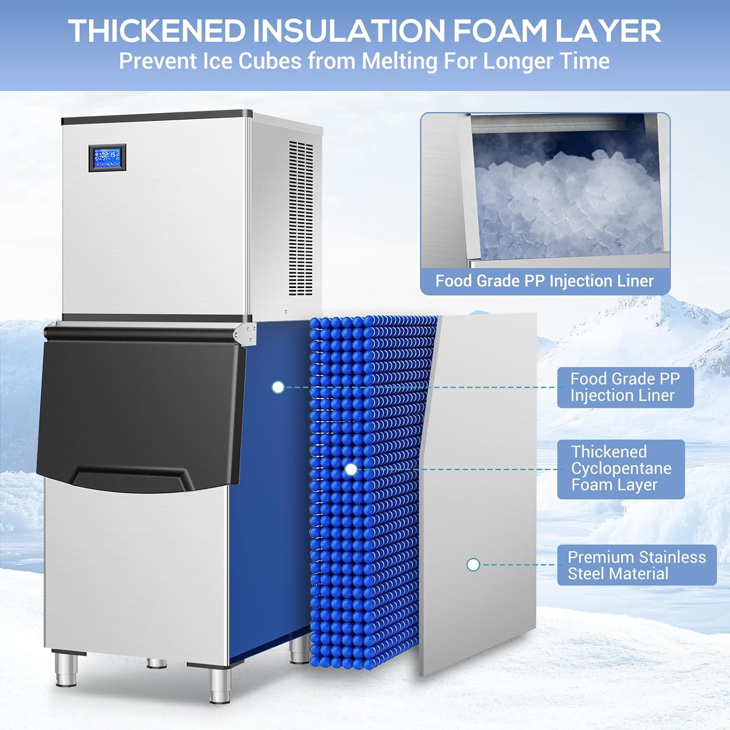 - The ice maker machine features an easy-to-use LCD panel that allows you to easily select the ice-making time and thickness, with a range of functions including a 1-24 hour timer, ice-full reminder, and automatic cleaning. The self-cleaning function helps extend the machine's life by maintaining its internal cleanliness, which ensures that the ice cubes produced are clean and safe to consume (NOTE: Keep the ice machine upright for 24h before first use)