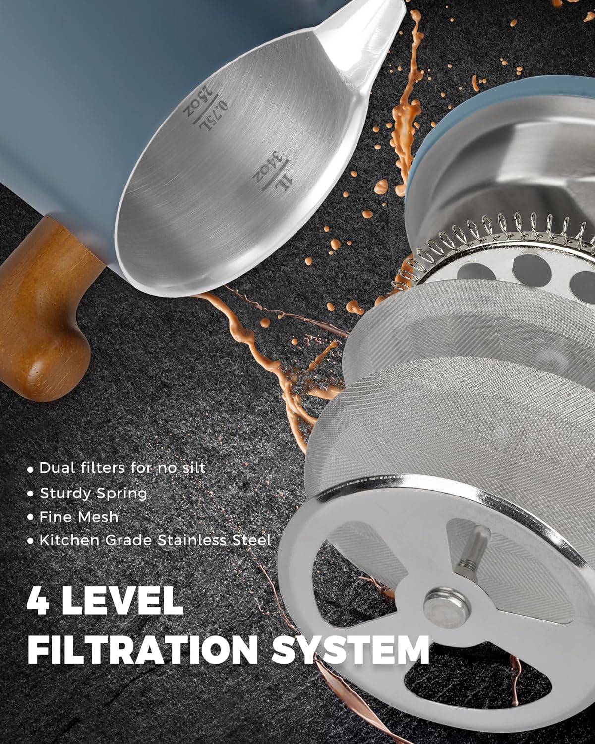 POLIVIAR French Press Coffee Maker, 34 oz Coffee Press with Real Wood Handle, Double Wall Insulation & Dual-Filter Screen, Food Grade Stainless Steel for Good Coffe and Tea, JX2025-XFPU