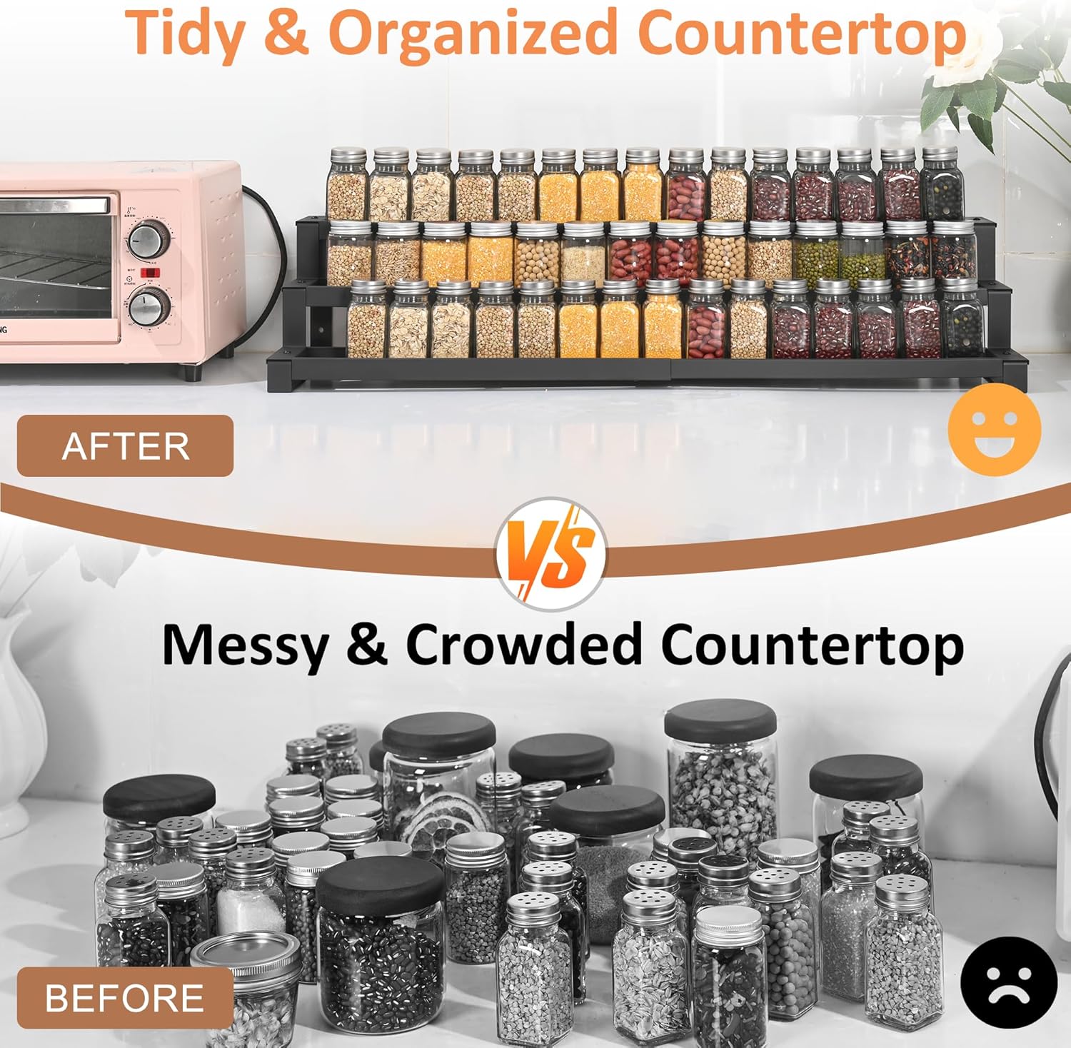 - 3-Tier Expandable Design: Expands in length from 16.1" to 29.5" to fit narrow cabinets and shelves—requires cabinet depth over 11" to fit properly. Holds 30+ spice jars or cans with tiered visibility, keeping your storage neat and accessible