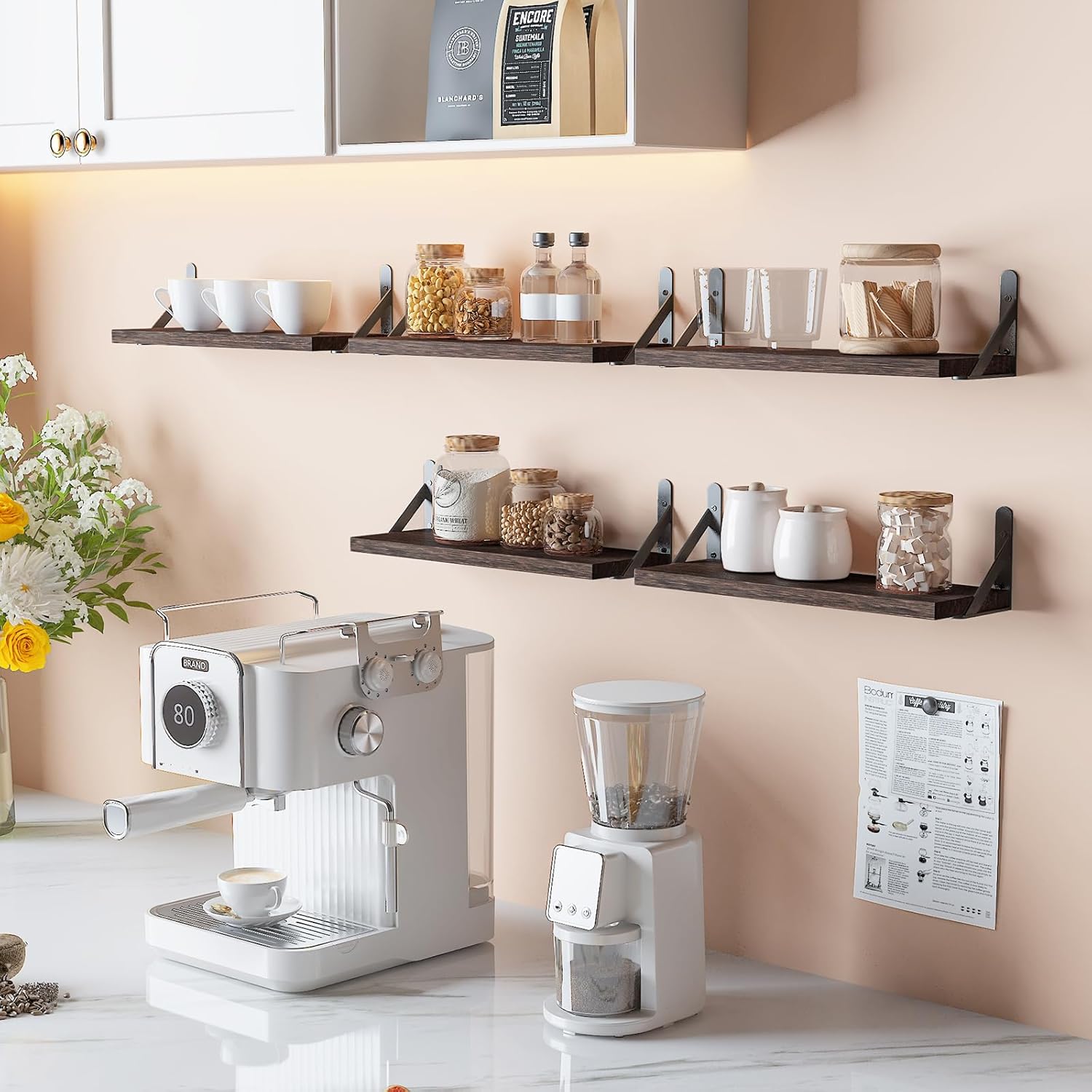 YGEOMER 16.5 Inch Floating Shelves for Wall, Farmhouse Wall Shelves for Bedroom, Bathroom Storage, Living Room and Kitchen Decor (Set of 6 Brown)