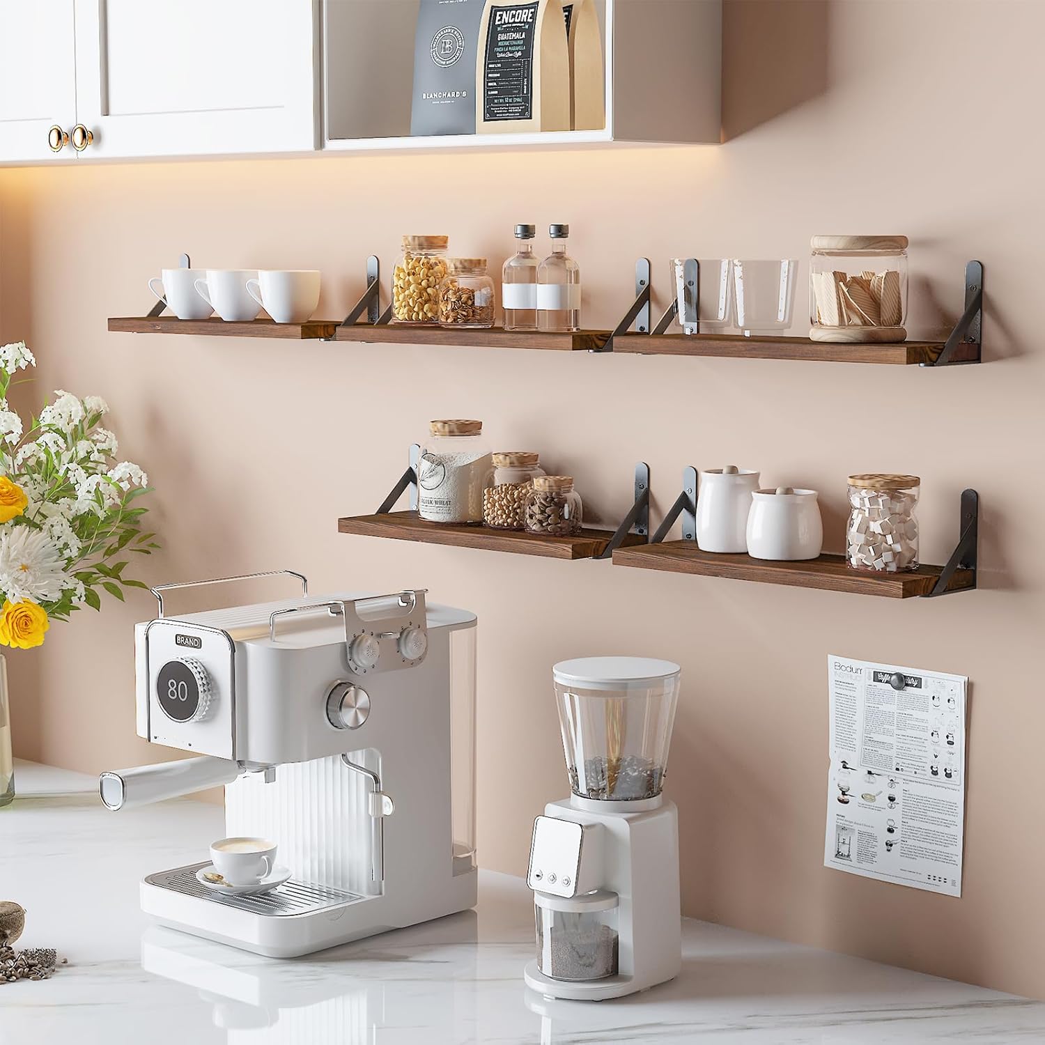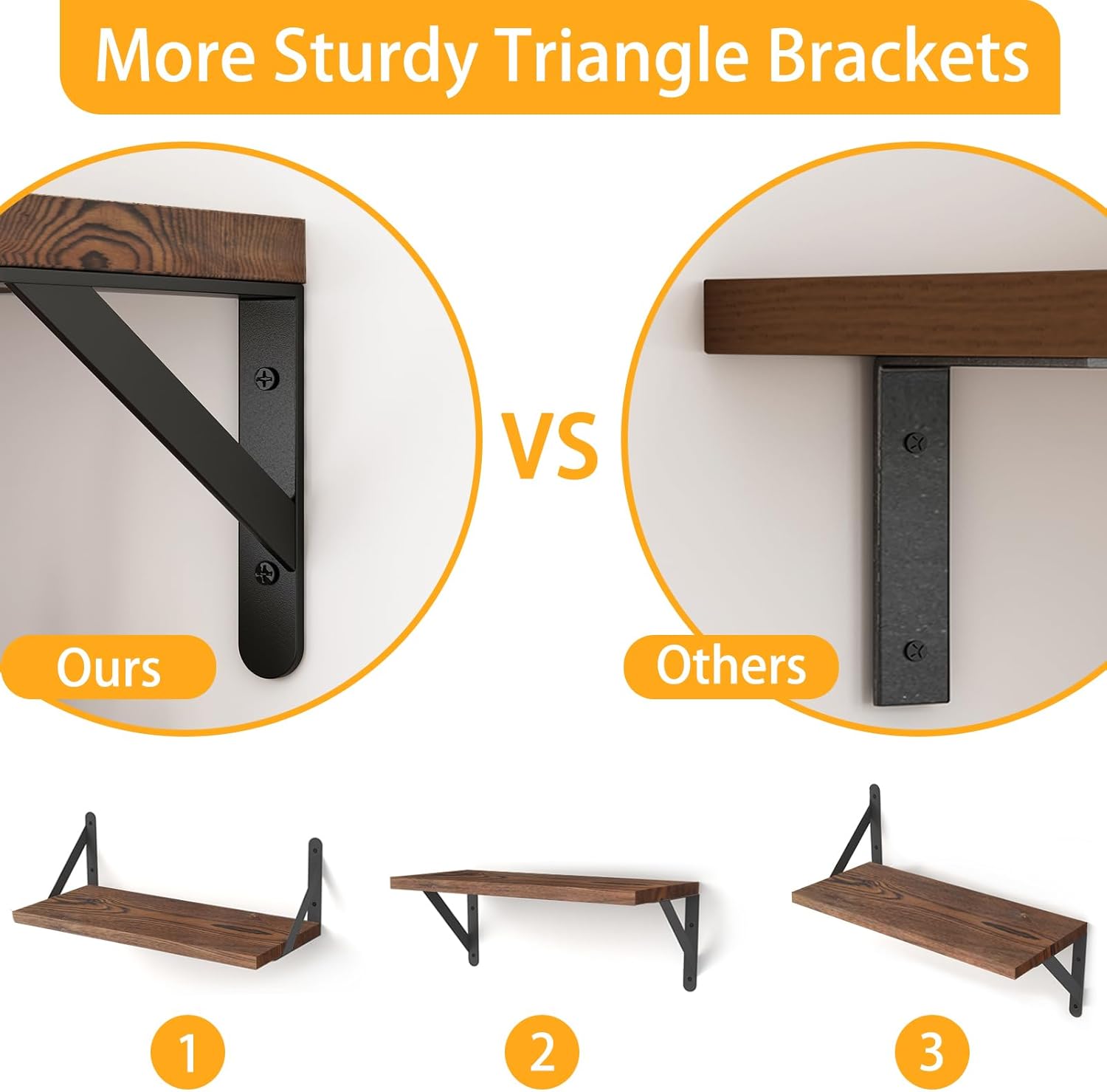 - 【Floating Shelves for Wall】This is a set of Six 16.5 inch long dark carbonized pine wall floating shelves, which is flexible and creative to create your own storage space. Our wall shelves are suit for all-type rooms because they process a simple & simple design.You can combine our floating wall shelves in any way you want.