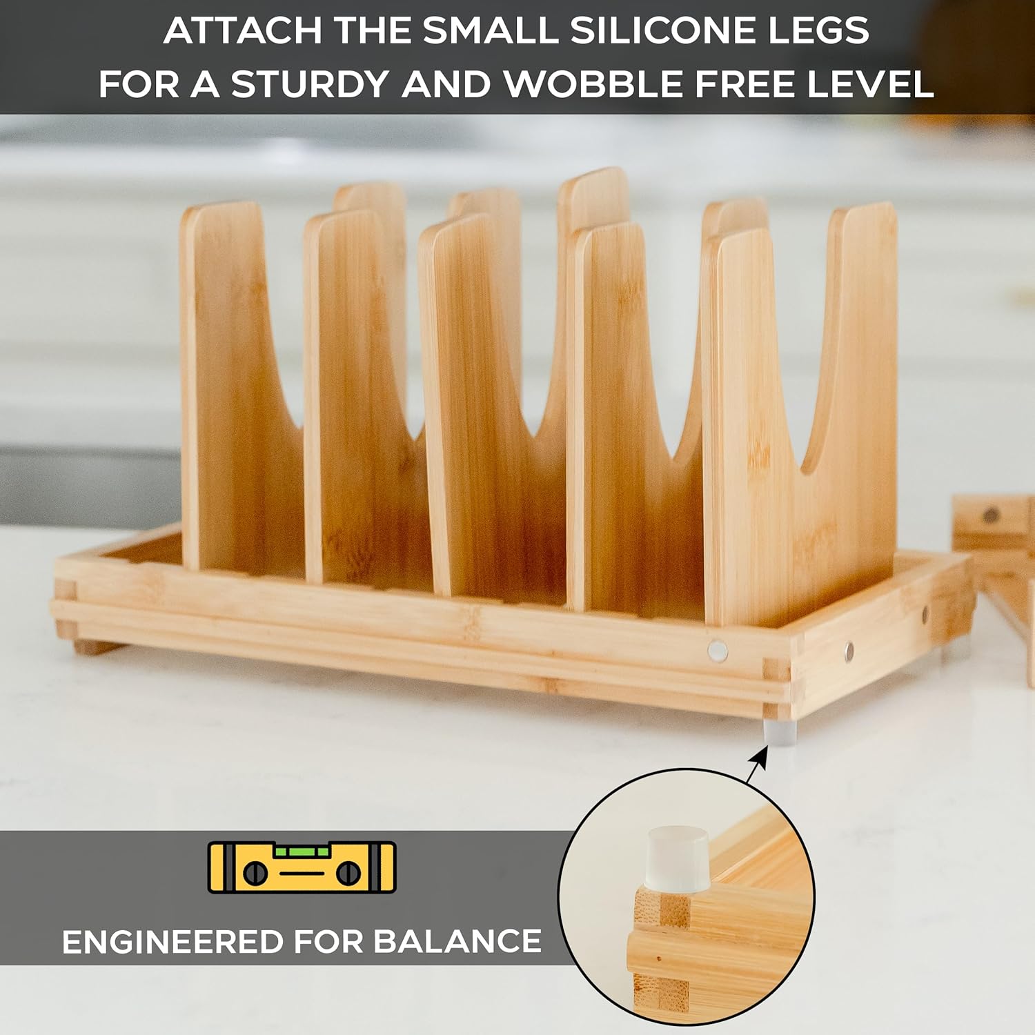 - NO-SLIP STABILITY – Silicone pads on the bottom and leveling feet on the detachable base prevent movement and protect shelves. This pan lid organizer stays steady on all surfaces—no wobble, no scratches, just smooth, reliable everyday use in cabinets or drawers.