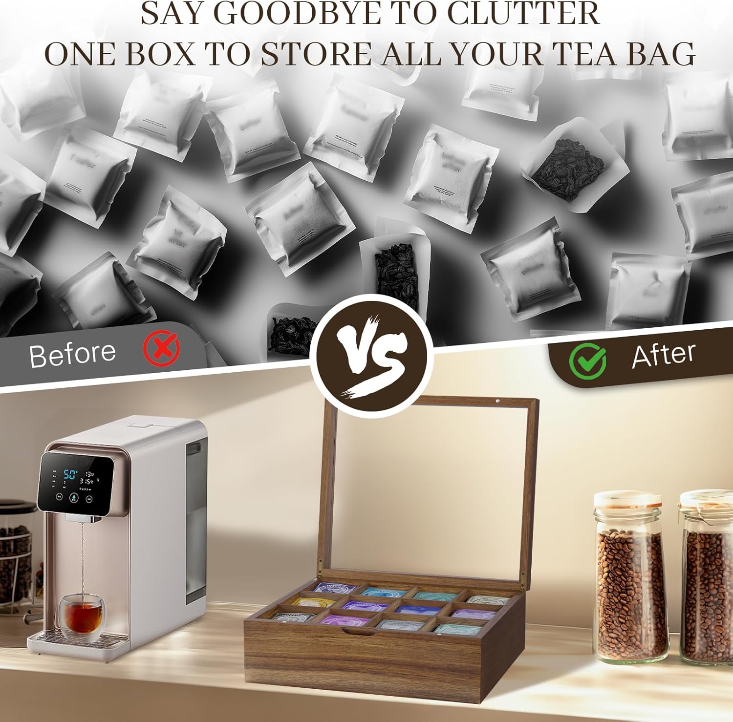- [Attractive Design]: Our tea caddy for tea bags organizer is loved by tea lovers for its simple aesthetics and practical design. It is a tasteful and practical gift suitable for tea lovers, parents, friends, colleagues and bosses, allowing the fragrance of tea to accompany every beautiful moment.