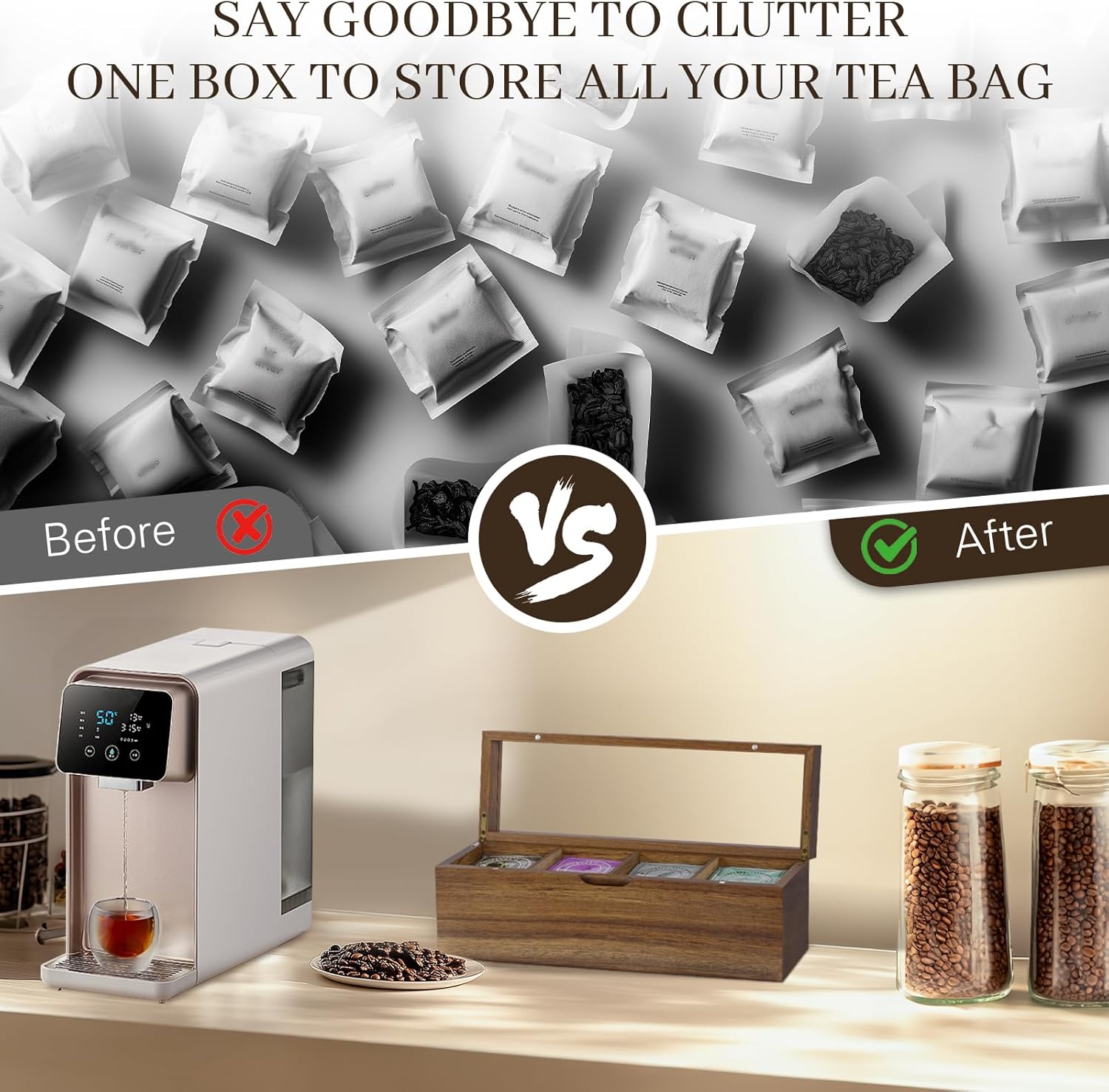 - [Elegant and Practical]: The transparent acrylic lid design of this tea organizer for tea bags allows you to see all the tea bags without opening the box, so you can quickly find your favorite flavor. The thoughtful lid opening groove design, coupled with the magnetic closure, is stable and dustproof. It is both practical and beautiful, adding a touch of exquisite style to the kitchen or coffee table.