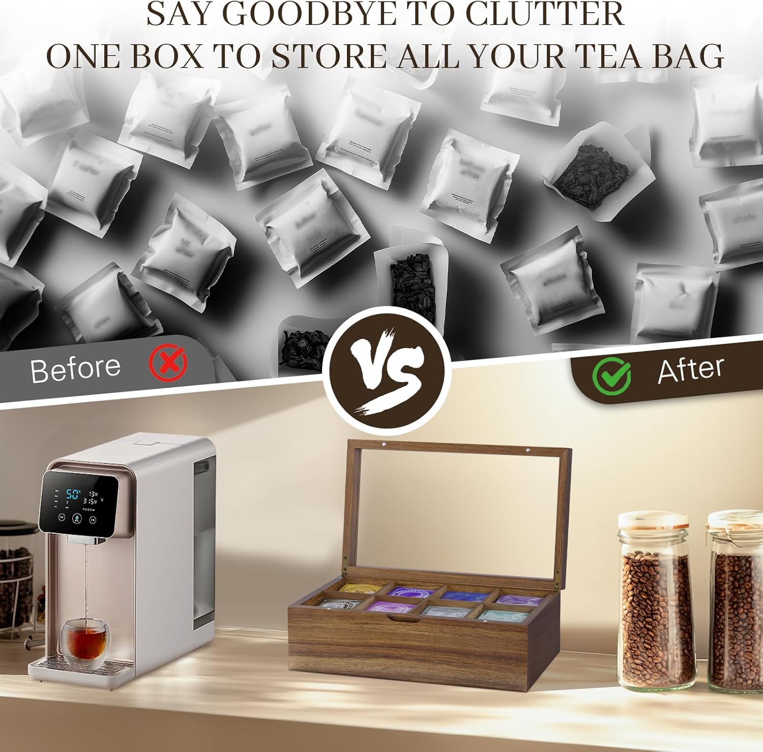 - [8 Flexible Compartments]: This upgraded large-capacity tea bag organizer can easily store enough tea bags. The removable partition design allows you to freely adjust the space to meet the needs of different tea bag classifications, and it is easier to clean and maintain. The tea storage box makes your kitchen countertop free of clutter and your life more elegant!