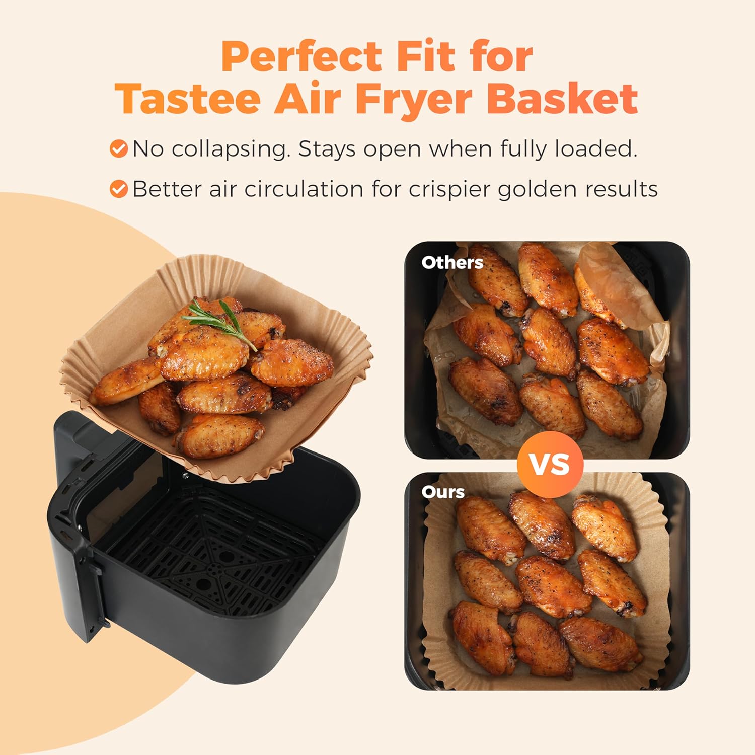 - Custom-Designed for 3-6QT Baskets: Exclusive low-edge technology (50% lower than standard 4.5cm liners!) prevents food wrapping around edges. Engineered for compact baskets, ensuring full food exposure to hot air. Say goodbye to uneven cooking!