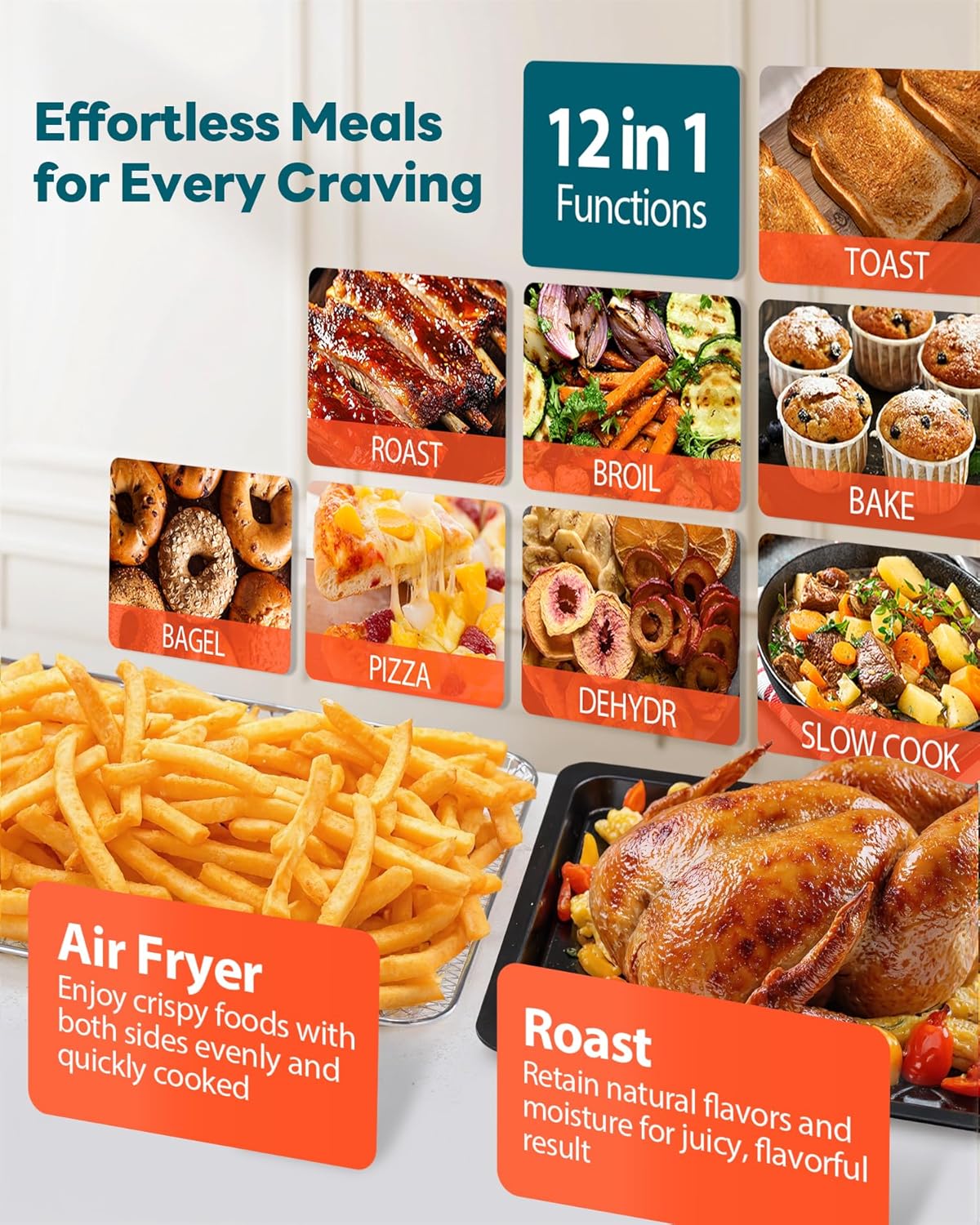 - πππ ππππ, ππ ππππ ππ ππππ: No more juggling multiple appliances. Belicious Pro air fryer oven replaces multiple gadgets with 12 one-touch functions, Air Fry, Toast, Bake, Broil, Roast, Reheat, Warm, Slow Cook, Preheat, Rotate, and Dehydrate. From snacks to full dinners, it handles it fast and easy while saving time, space, and cleanup.