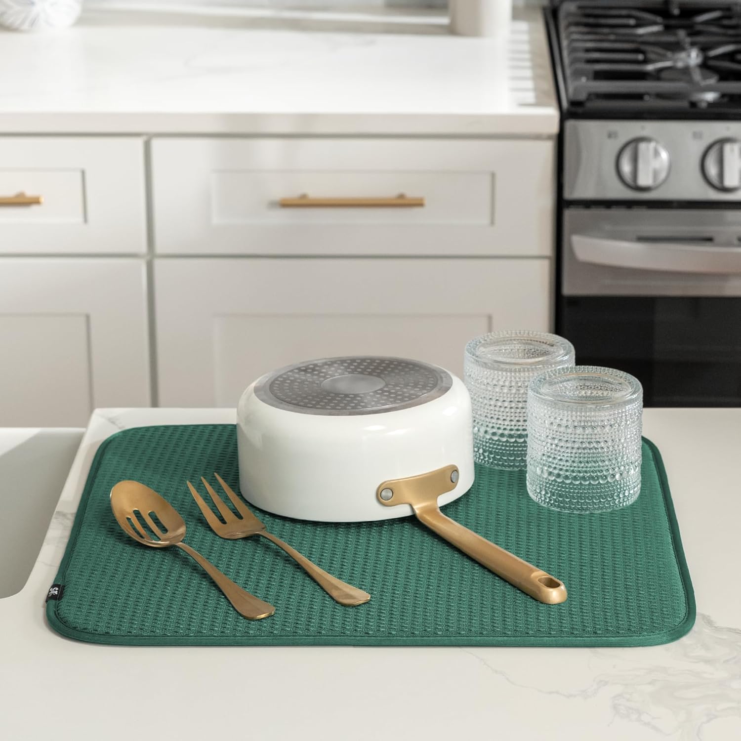- Catch the kitchen sink drips under a dish drying rack or place your plates, forks, spoons, pots and pans set, or glassware directly on the drying mat