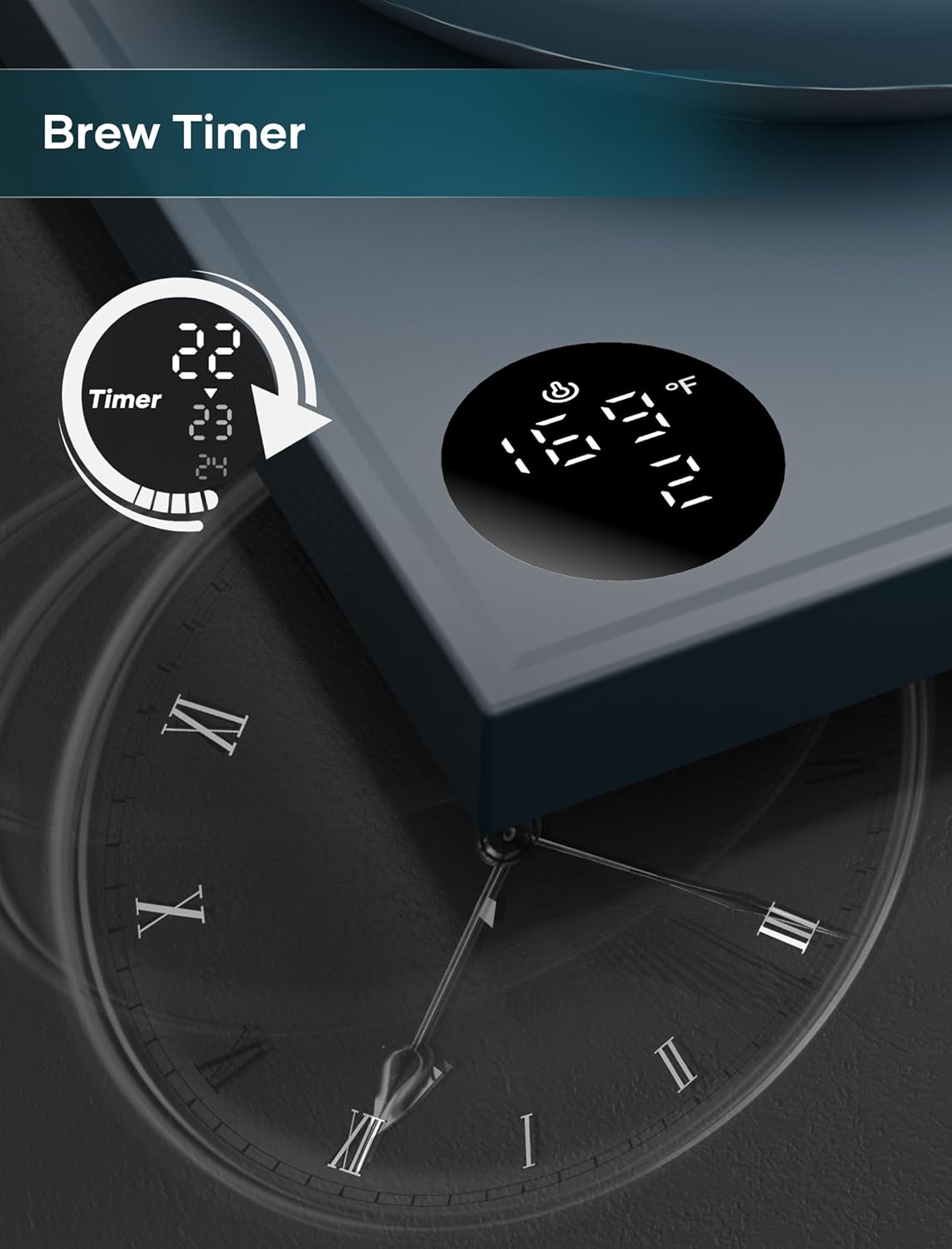 - ±1℉ Temperature Accuracy - The intelligent base's built-in temperature control program. The program will adjust the heating power when the water temp approaches the desired temp according the temp probe detects the temp change.