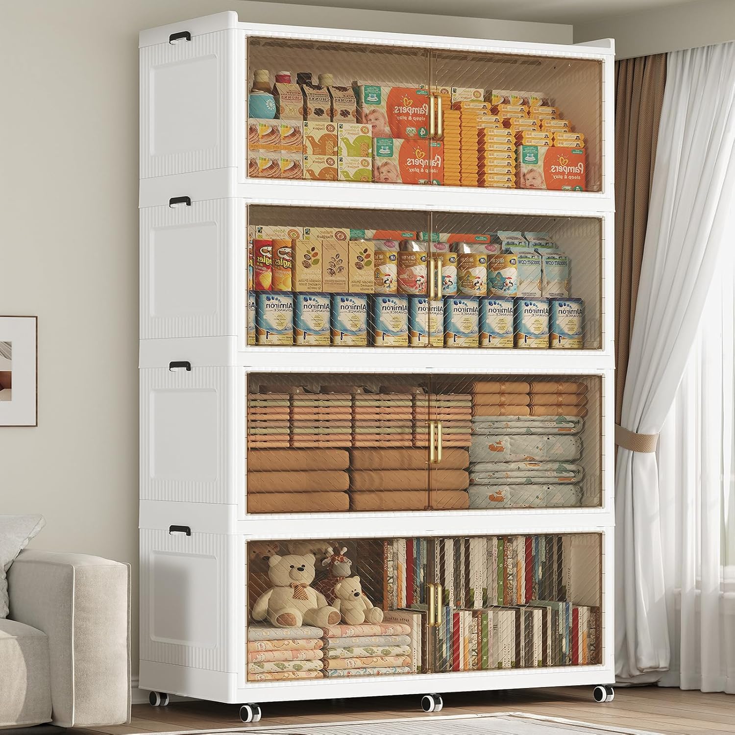200GAL Extra Large Storage Bins with Lid, 800QT Plastic Stackable Storage Bins with 6x Wheels, Collapsible Closet Organizer and Storage Drawer Cabinet for Living Room Office Dorm, 4Pack White