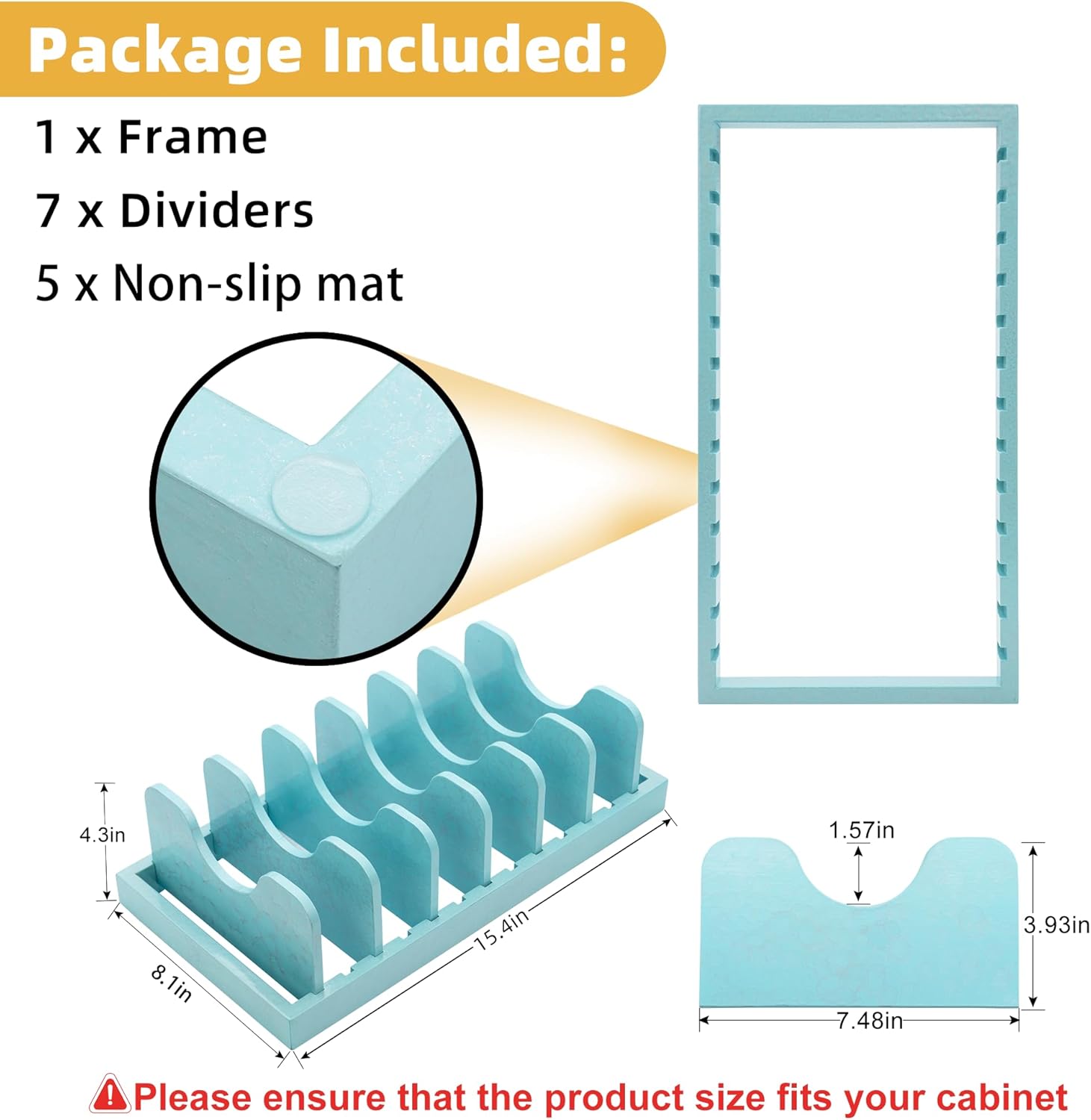 - Dimensions - Overall Dimensions :15.4" x 8.1"; There are 7 slots with width to suit your different needs. The design of the partition can better place the pot lid. Every detail change is to better display and store some kitchen items. It is a beautiful and practical kitchen storage item.