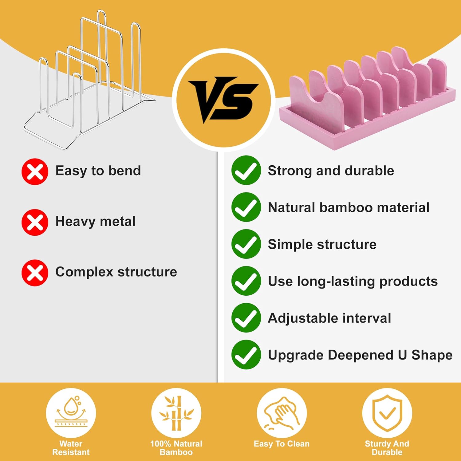 - Durable and Safe Material: It is made of natural bamboo products. The stand is better upgraded, more durable and stable to hold heavier cookware. Natural bamboo products can better match the cookware and style of the kitchen,The smooth surface can protect your kitchen items from being scratched