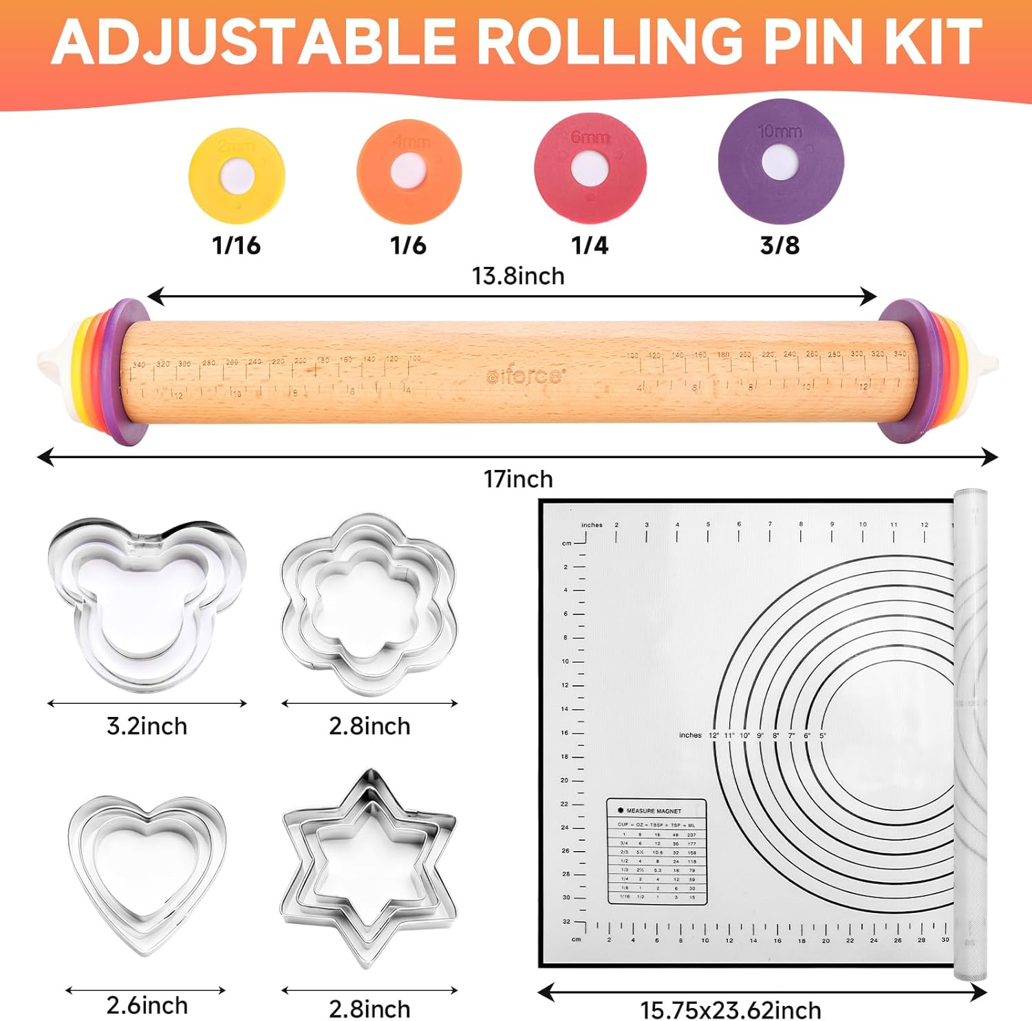 - 【4 Thickness Rings And Pastry Mat With Cookie Molds】With 1/16"(2mm), 1/6"(4mm), 1/4"(6mm)and 3/8"(10mm)rings of different diameters allow the rolling pin to rise to different dough heights to provide you with ideal thickness. Pastry mat are ideal for dough, bread, pastry, pizza, biscuit making, and can be kept neat and tidy on the table for easy collection;12 cookie molds of different shapes and sizes to create various cookie patterns of different sizes for you.