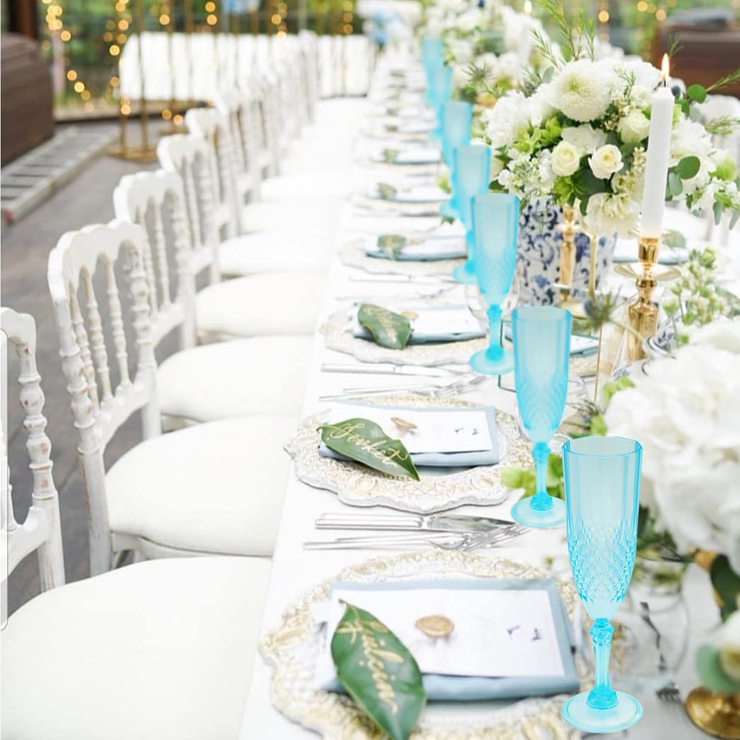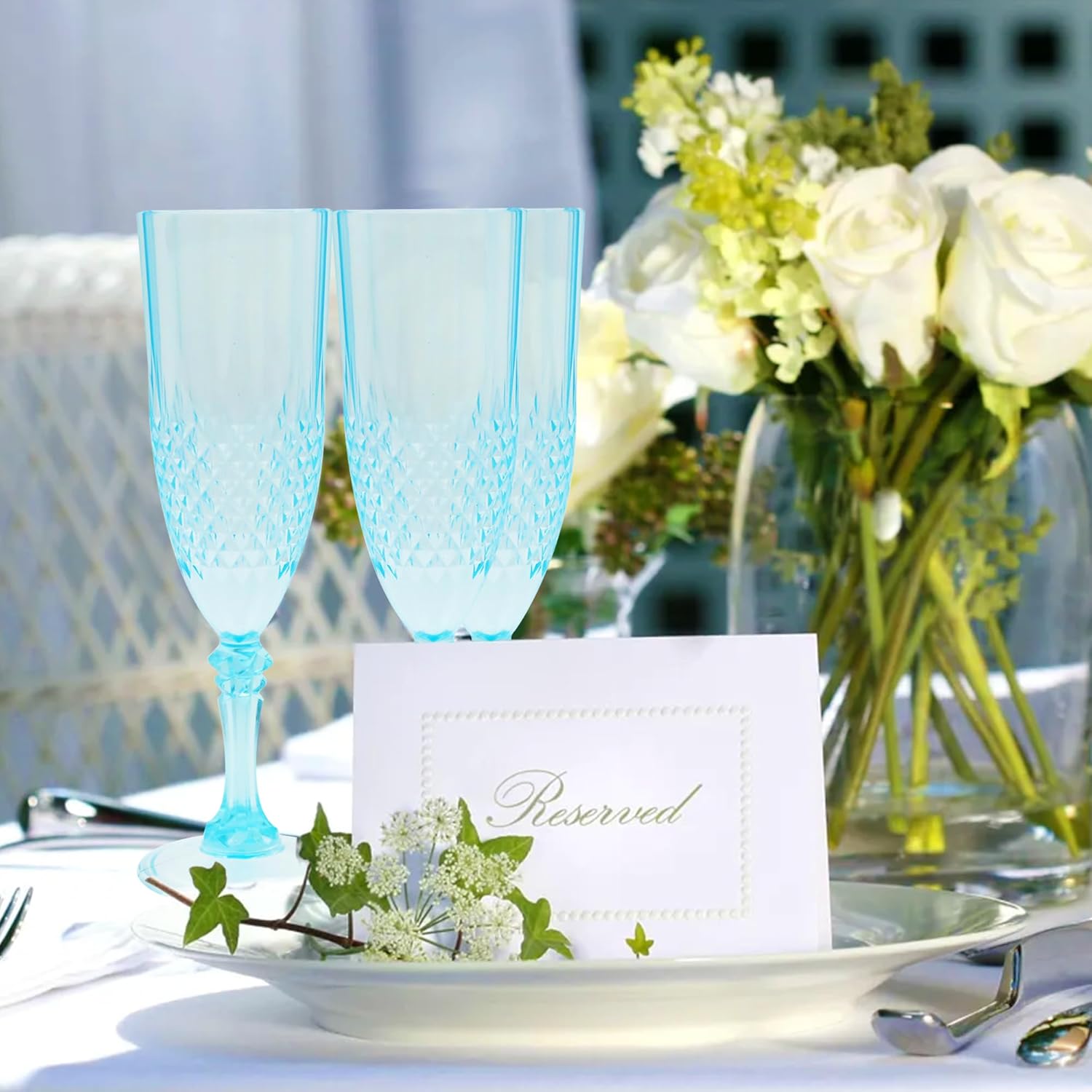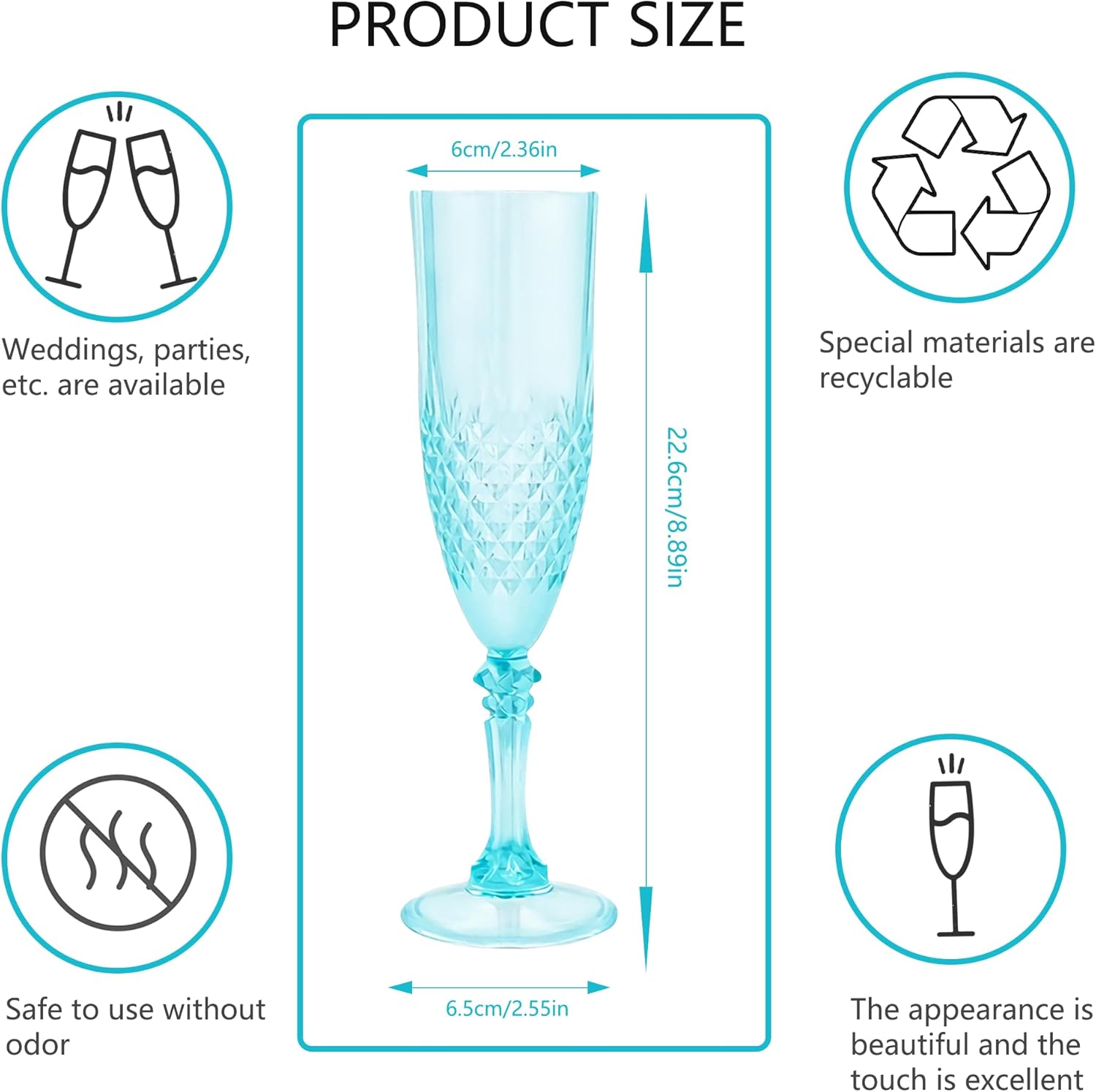 - Charming Set: Champagne flutes set include 24 retro-style light cyan champagne plastic wine glasses, providing ample quantity to meet your daily use and replacement needs. A suitable champagne cup is the icing on the cake. Plastic wine glasses not only carry the wine, but also carries the laughter and blessings