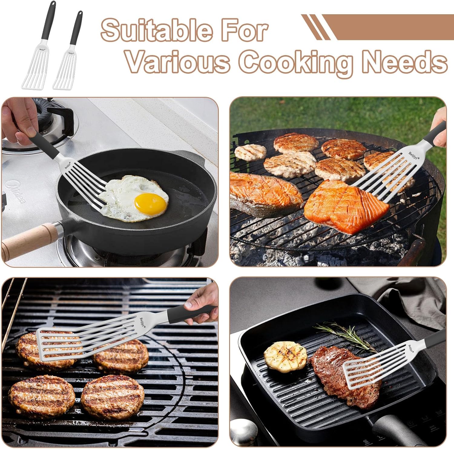 - Stainless Steel Spatula Set: This cooking utensils with a 13.5-in large fish spatula and an 11.7-in small fish spatula, as a metal fish spatula for cast iron skillet kitchen use or grilling cooking, for flipping fish, egg, burgers and other delicate foods