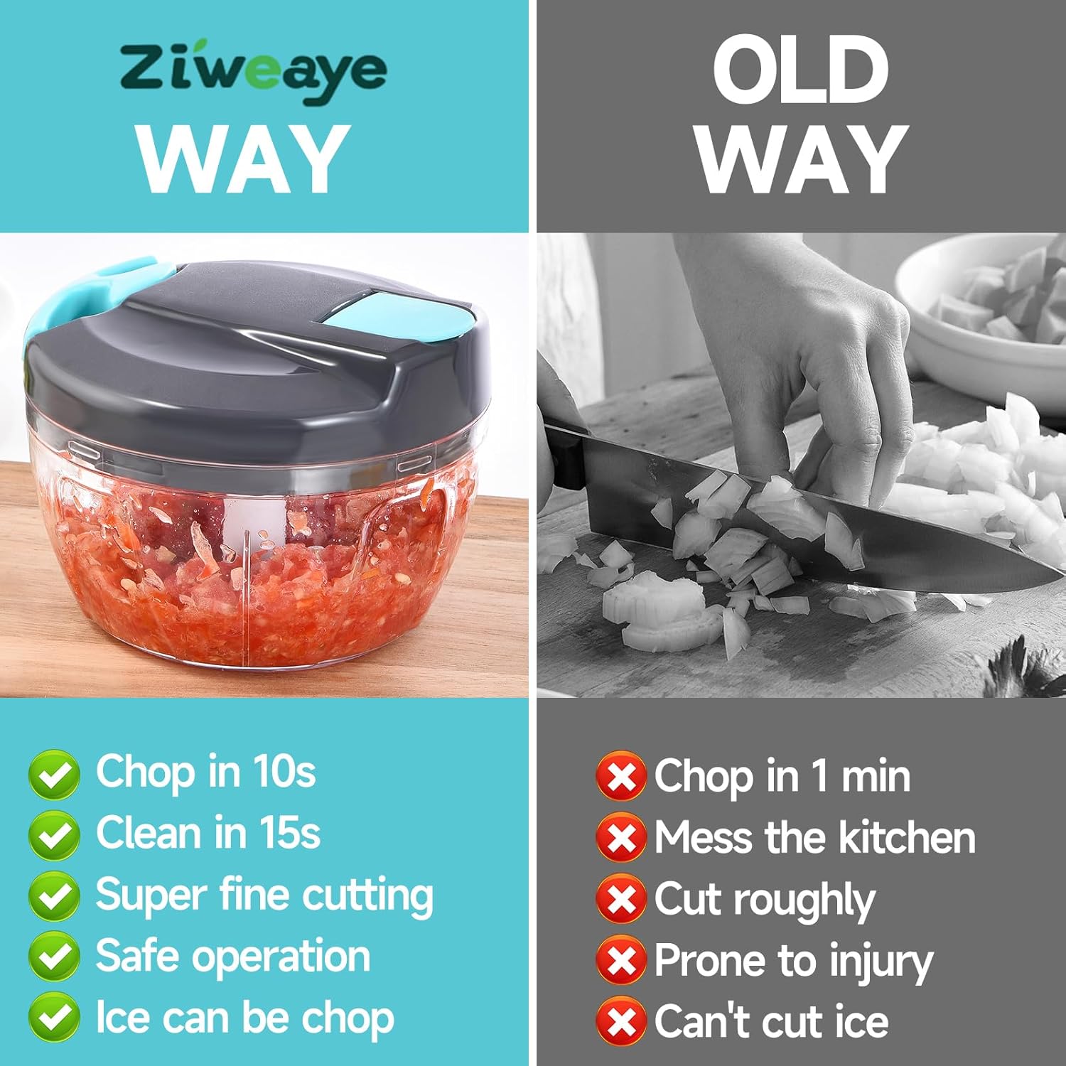 - Control the size of foods by the times you pull string: ten times for coarse chopping, fifteen times for medium, and twenty times or more for puree. There :are many advantages with our garlic chopper: It runs without electrical, no technology to set up, is super simple to use and clean and, best of all, is less noisy than an electric processor. Compared with traditional knives, our onion chopper does not need to touch the blade during use, which is safer. It will also make your countertop cleaner.