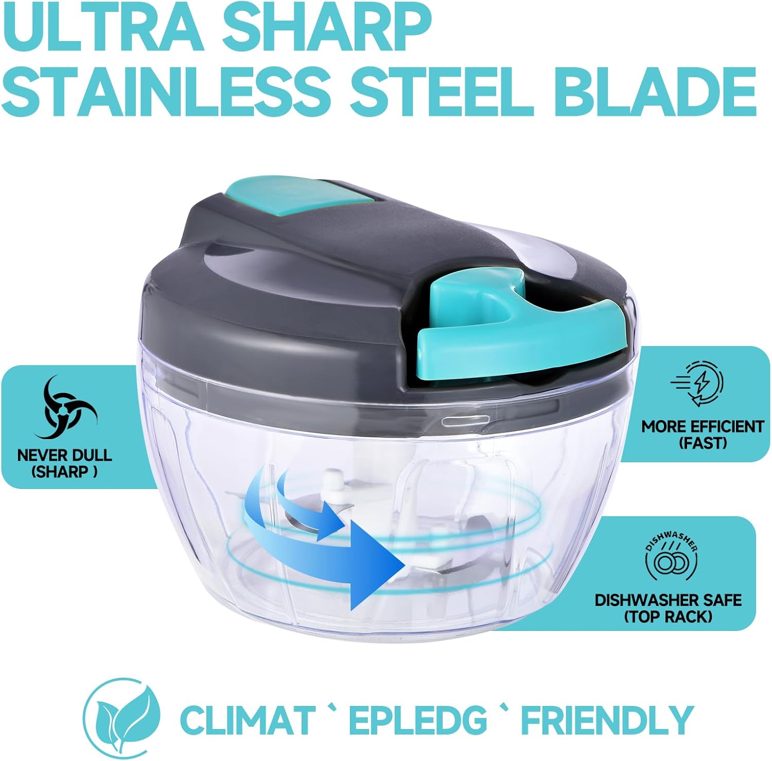 - The blade is extremely sharp: The blades of garlic chopper are made from 423 stainless steel and will not bend or rust. The three blades are arranged in different directions and heights to ensure that all the ingredients can be chop evenly,Safe & Durable Material: The bowl is made from thickened BPA free plastic that has been passed the falling test. The durable nylon string withstand thousands of times pull. The design of handle is according to human engineering mechanics, perfect joint your palm.