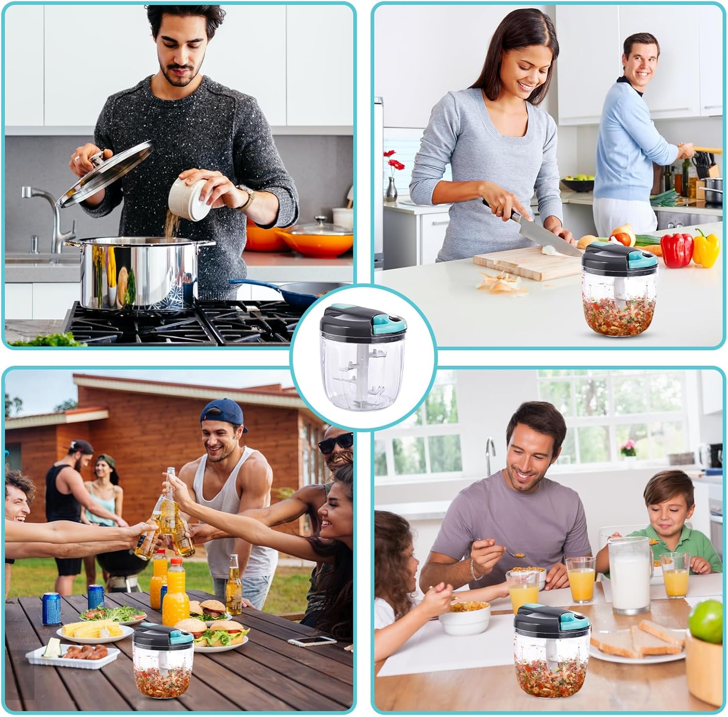 - Our pull food chopper meets most of your kitchen needs: The manual food processor is ideal for chopping onion, garlic, ginger, vegetables, fruit, nuts, herbs, meat, tomato, avocado and more for salsa, pesto, smoothie, guacamole, ground beef and more,Chopped Onions in seconds without crying, and chopping garlic without smell.