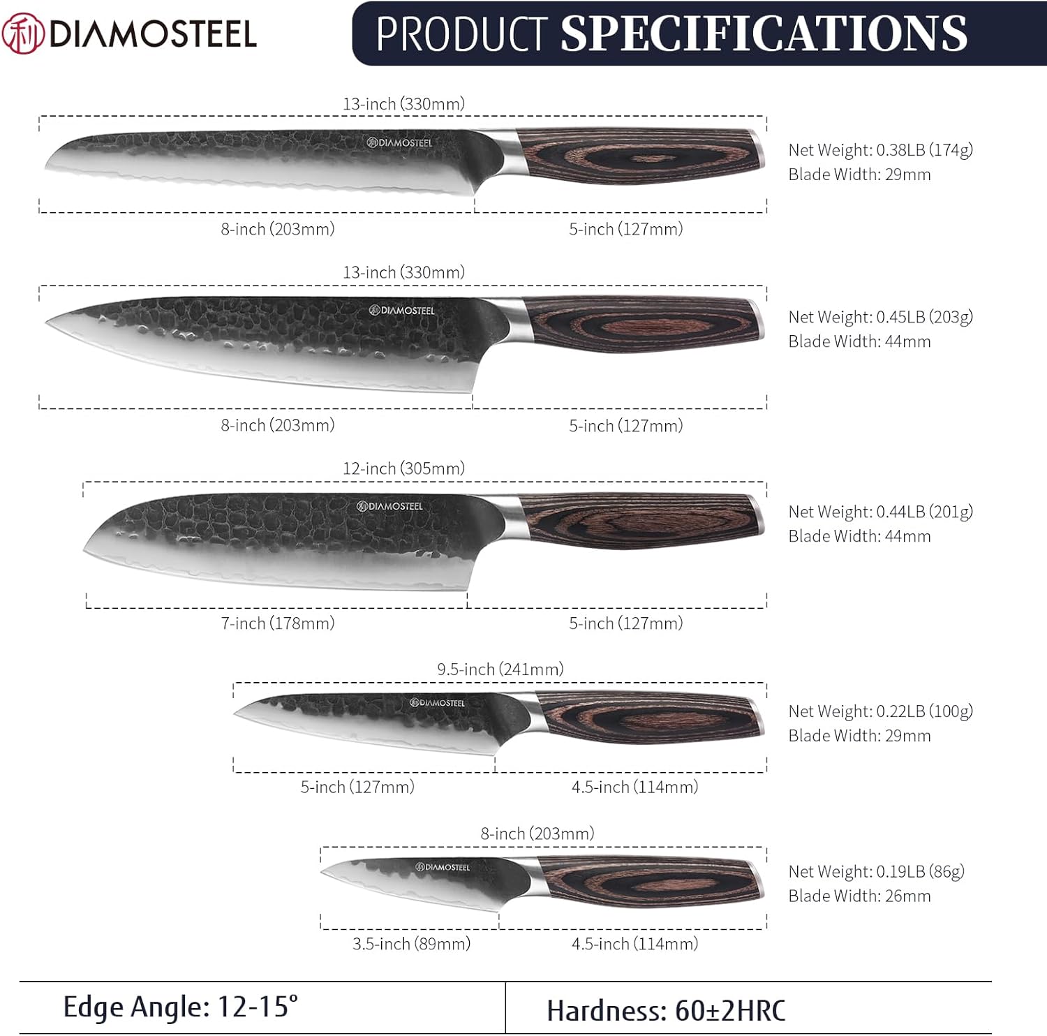 - Versatile 5-Piece Knife Set - Diamosteel kitchen knife set includes an 8-inch chef's knife,a 8-inch serrated bread knife, a 7-inch santoku knife, a 5-inch utility knife and a 3.5-inch paring knife for every slicing, dicing, mincing, or chopping need. This knives set for kitchen equips you for any cooking style, from daily meals to gourmet creations.