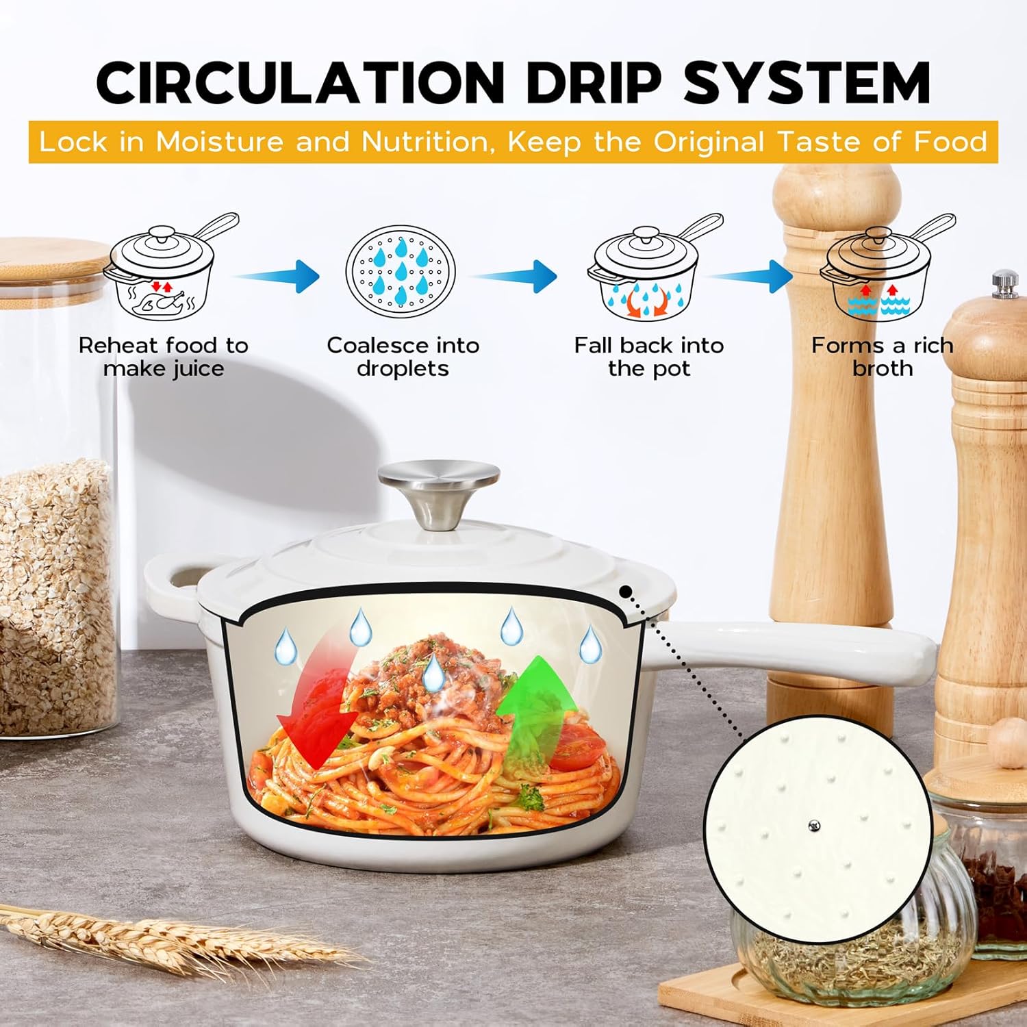 - Self Basting Lid: the raised dots underneath the lid collect condensed steam or broth and redirect it back onto the food, preserve the natural flavors and make food juicy, no seasoning required
