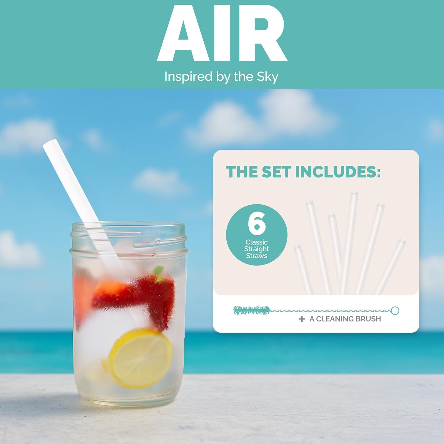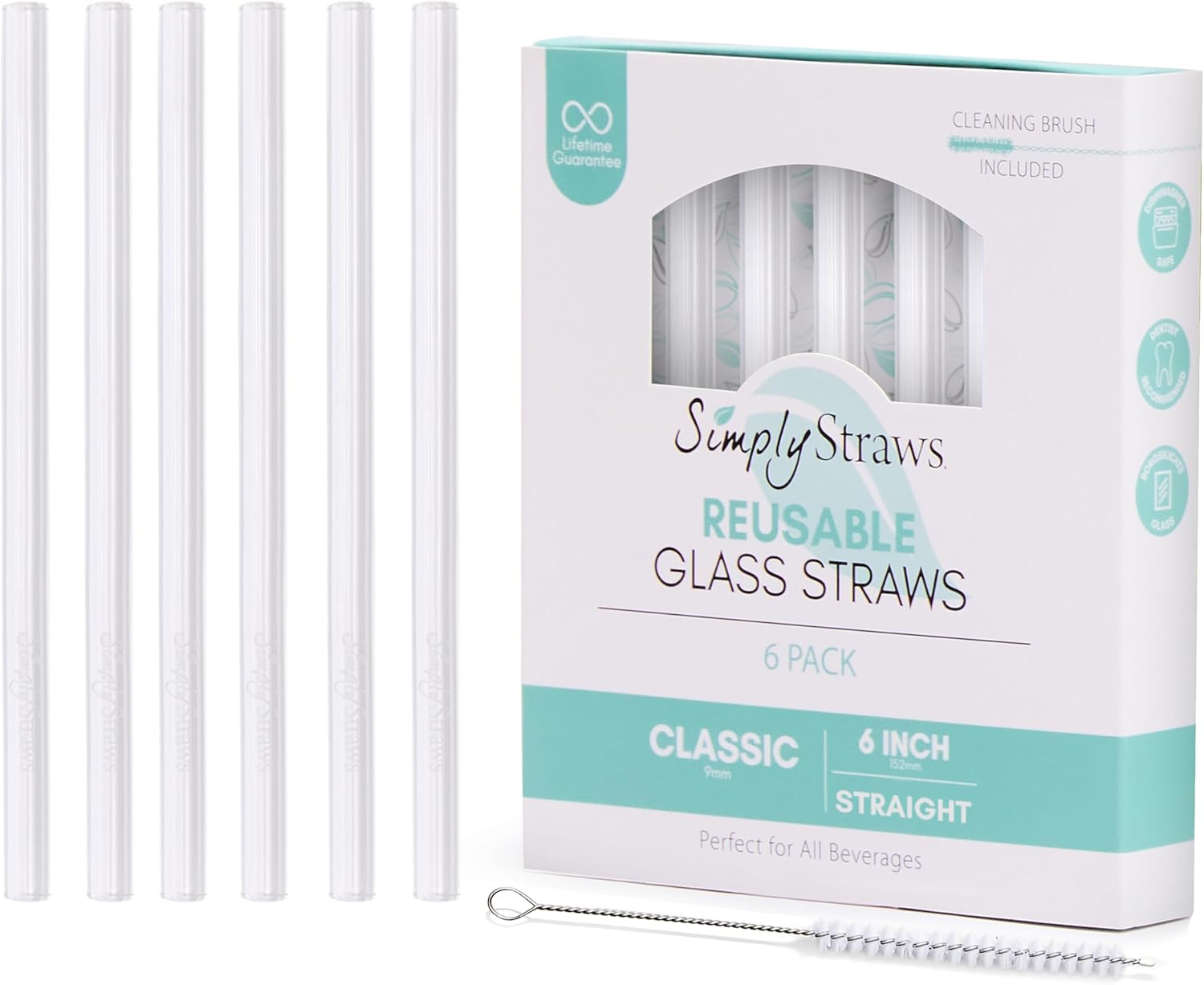 Simply Straws 6 Inch Glass Straws Straight (6-Pack) – Reusable Glass Straws for Low Balls & Stemless Glasses, with Cleaning Brush – Dishwasher Safe, Hot & Cold Use, BPA-Free (Air)