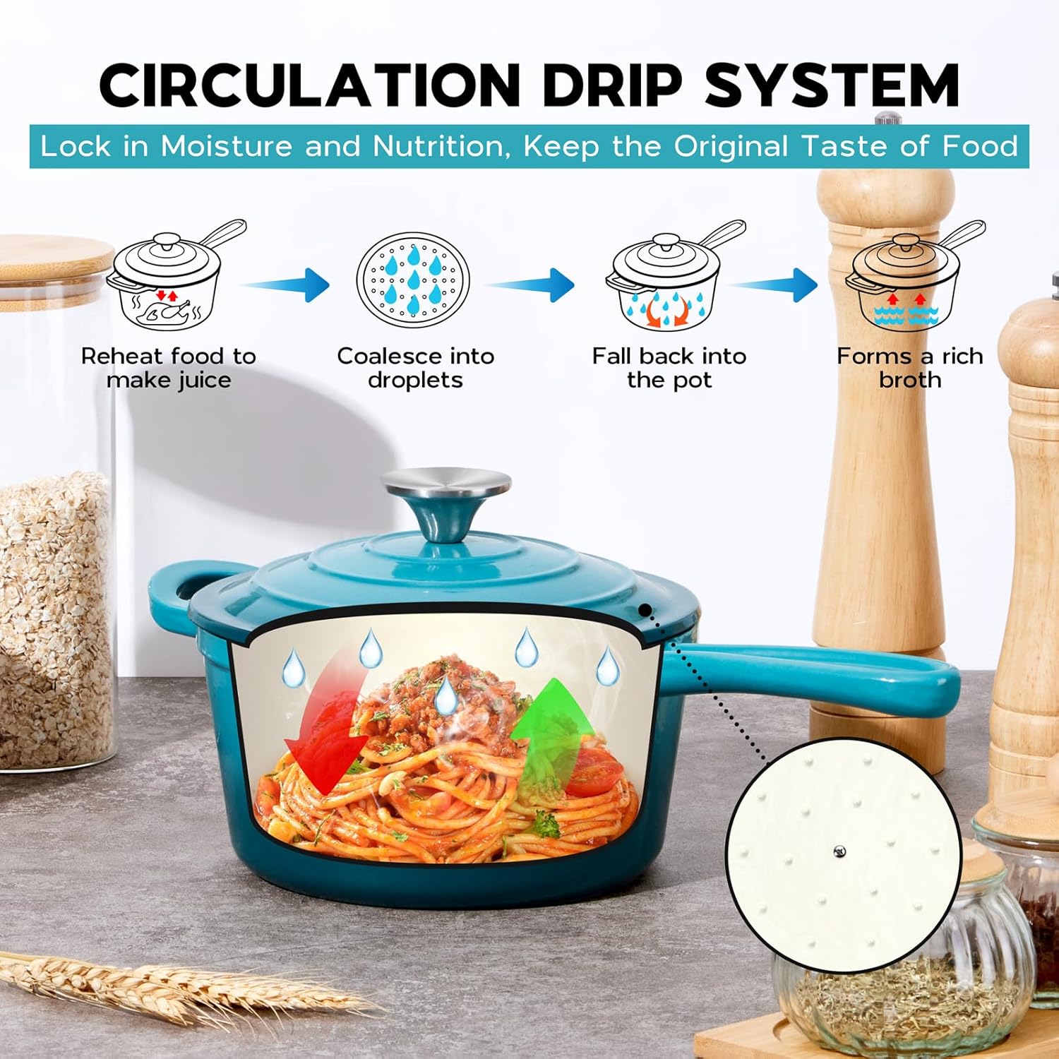 - Self Basting Lid: the raised dots underneath the lid collect condensed steam or broth and redirect it back onto the food, preserve the natural flavors and make food juicy, no seasoning required