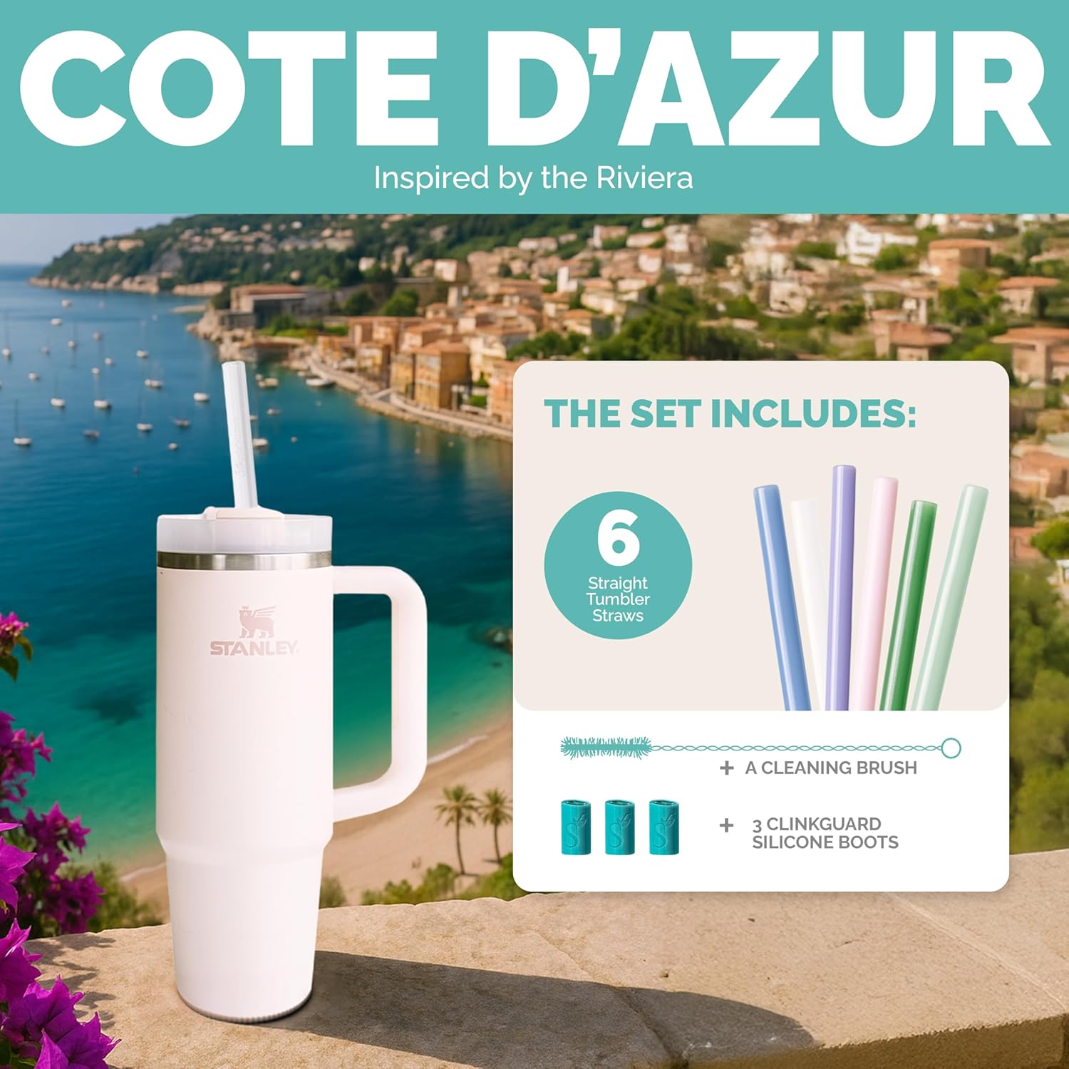 Simply Straws 12 Inch Glass Straws Straight (6-Pack) – Reusable Glass Straws for Stanley 40 Oz Tumbler, with Cleaning Brush – Durable, Dishwasher Safe, Hot & Cold Use, BPA-Free (Cote d'Azur)