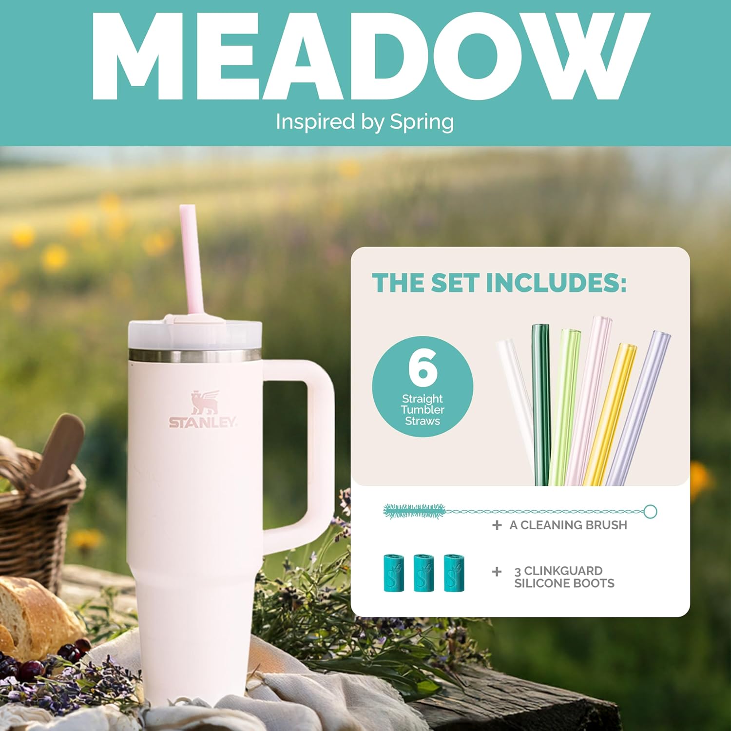 Simply Straws 12 Inch Glass Straws Straight (6-Pack) – Reusable Glass Straws for Stanley 40 Oz Tumbler, with Cleaning Brush – Durable, Dishwasher Safe, Hot & Cold Use, BPA-Free (Meadow)