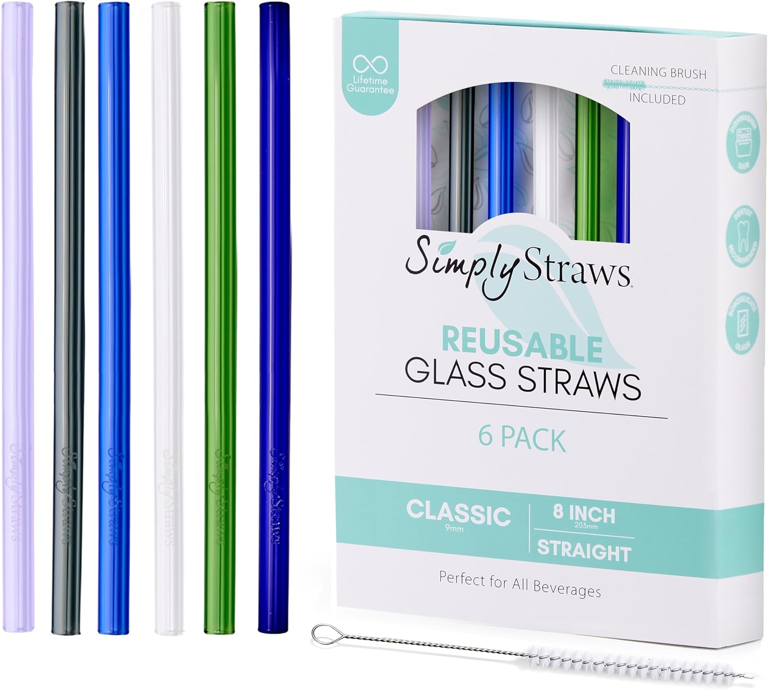Simply Straws 8 Inch Glass Straws Straight (6-Pack) – Reusable Glass Straws for Pints & Juice Drinkware, with Cleaning Brush – Dishwasher Safe, Hot & Cold Use, BPA-Free (Seaglass)