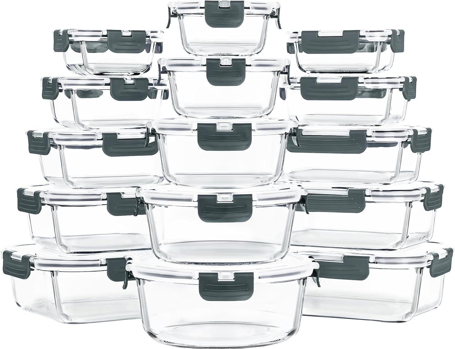 - All Possible Sizes: Simplify meal prep with 3-shape system: 4 round (1480ml+1040ml+640ml+370ml), 4 square (1100ml+800ml+520ml+320ml+160ml), and 5 rectangle containers (1300ml+970ml+640ml+400ml+215ml). With these glass lunch containers with lids, you can effortlessly organize meals for the week or store leftovers