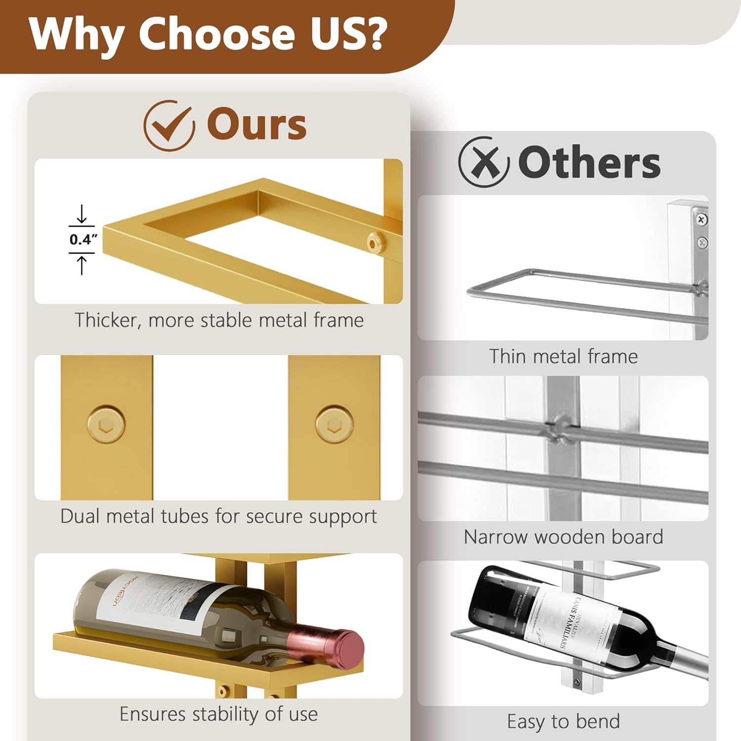 - 【Stylish and Modern】 The combination of storage, size, and aesthetics, this wall-mounted wine rack showcases bottles of different categories, heights, and depths, adding a sleek, modern element to any commercial or residential collection.