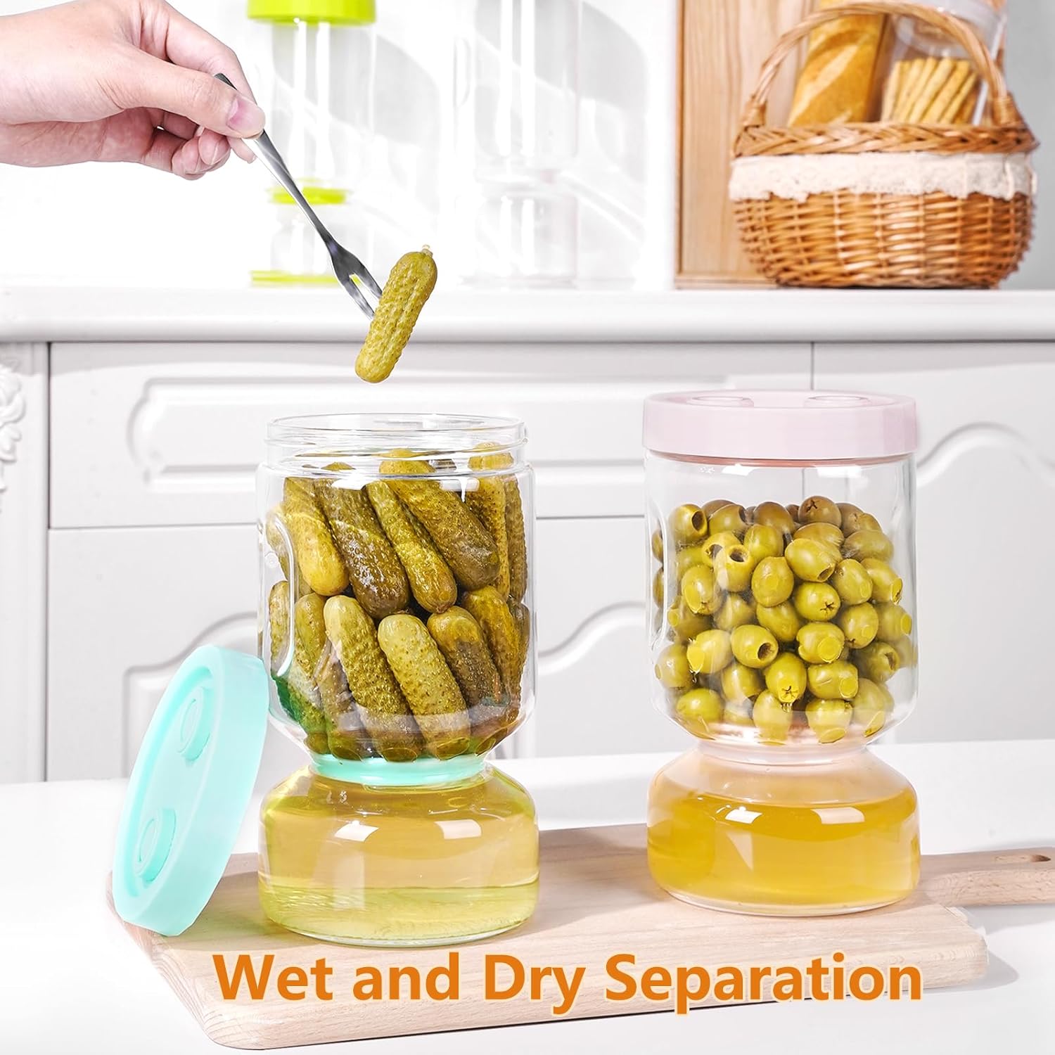 - PICKLE JUICE SEPARATOR JAR: Zens pickle container features a double-compartment design that separates wet from dry. Simply flip the jar over and the pickle juice runs quickly to the bottom. say goodbye to the wet pickle liquid and no more soggy dill on your sandwiches. It is perfect for Olives,Gherkins,jalapenos or Sliced Pickles, Hamburger Dill Chip Pickles.