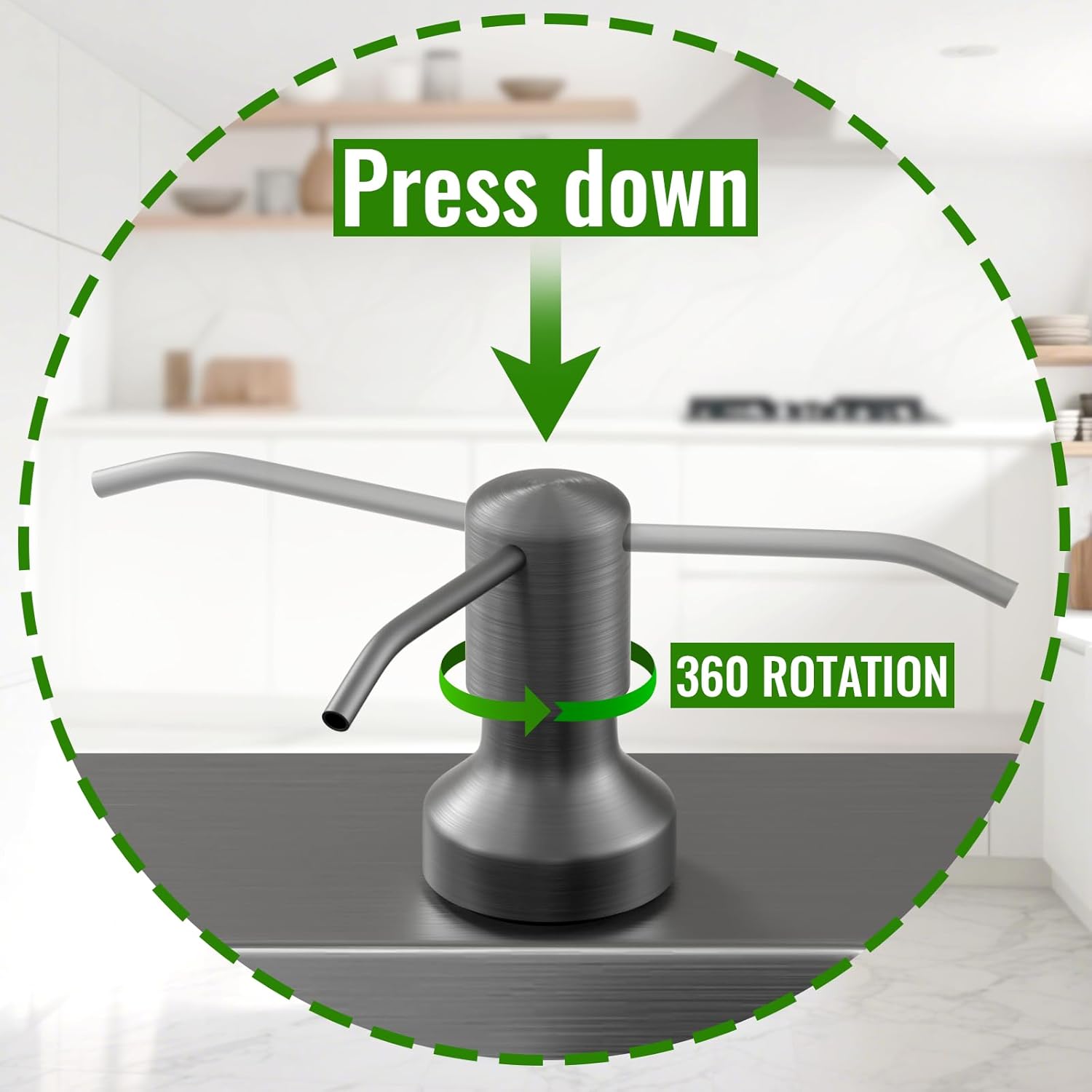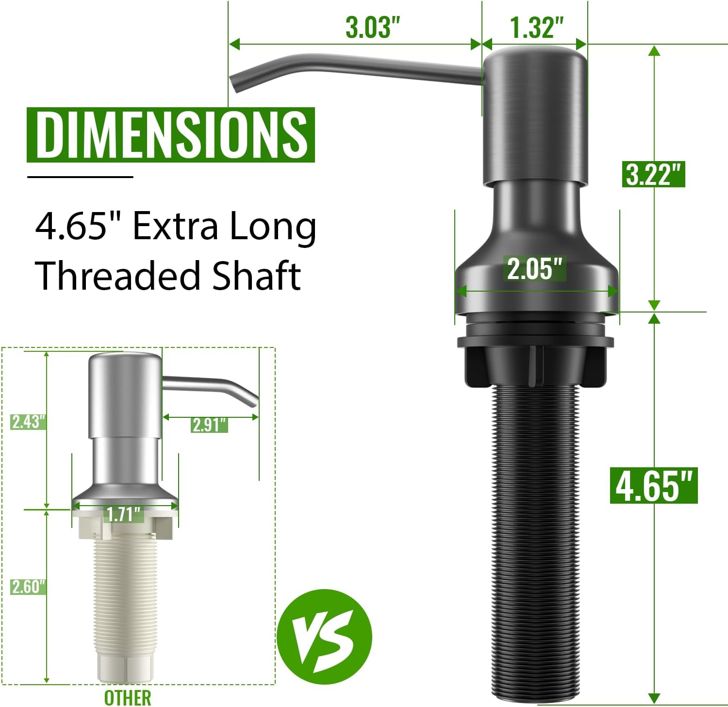 - Extra Long Threaded shank shaft:4.65 " threaded shank of soap dispenser can pass through most of deep countertops, like marble, stainless steel, wood or grantie. So it can also be used as a bathroom countertop soap dispensers. No worry about the thickness of your kitchen countertop.