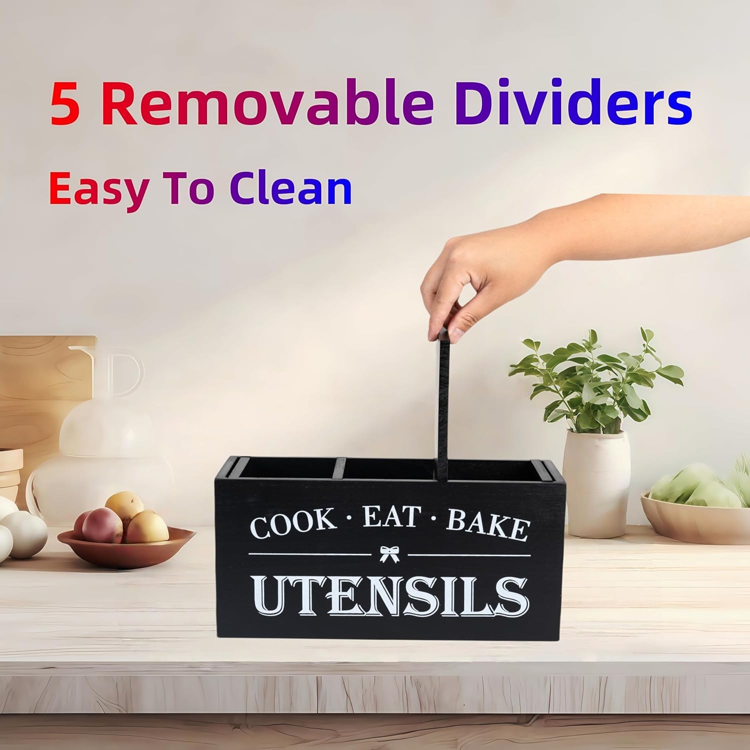 Utensil Holder,Large Wooden Utensil Holder For Kitchen Counter,Cooking Spatula Organizer,Big Storage Caddy With 3 Compartments Flatware Spoon Tool Cutlery(Black)