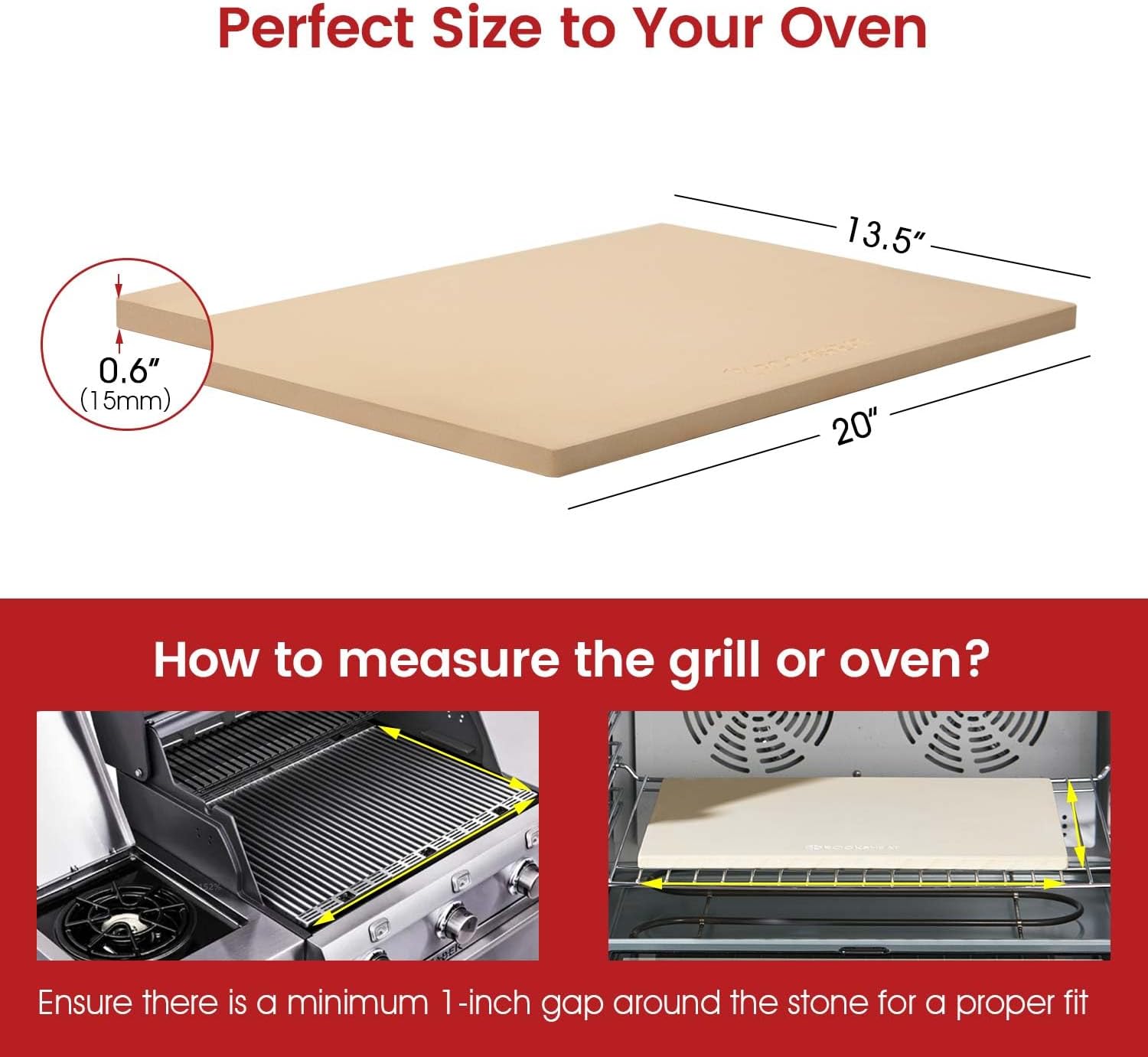 - ROCKSHEAT Rectangular 20" × 13.5” × 0.6" Pizza Stone, a versatile addition suitable for ovens, grills, and BBQs. Its generous size is perfect for 12-inch pizzas and a variety of other baked goods, making it an essential for home use and entertaining at pizza parties.