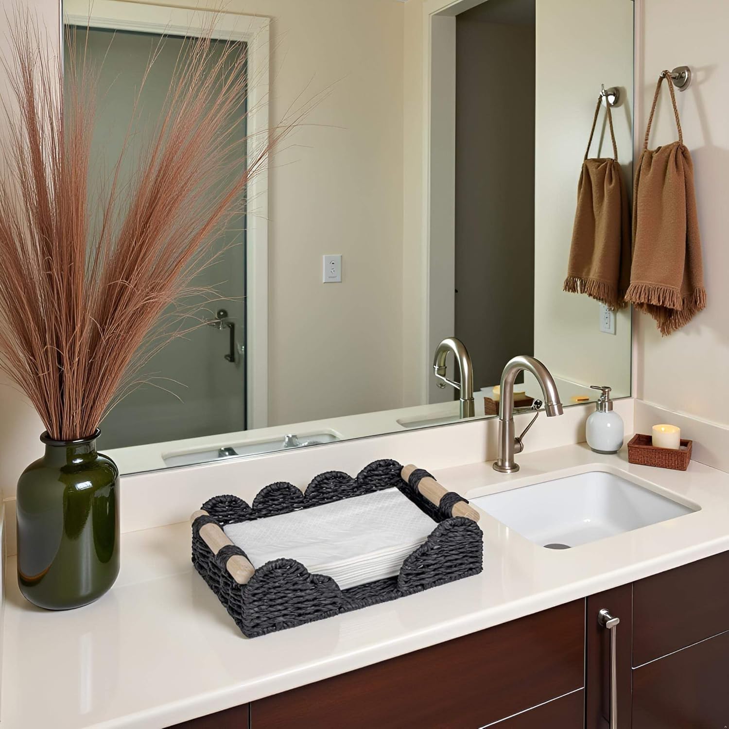 CubesLand Scalloped Napkin Holder for Bathroom Decor, Paper Rope Flat Napkin Dispenser Guest Towel Tray for Bathroom, Farmhouse Warm Napkin Holder for Table Dining Room Home Kitchen Decor, Black