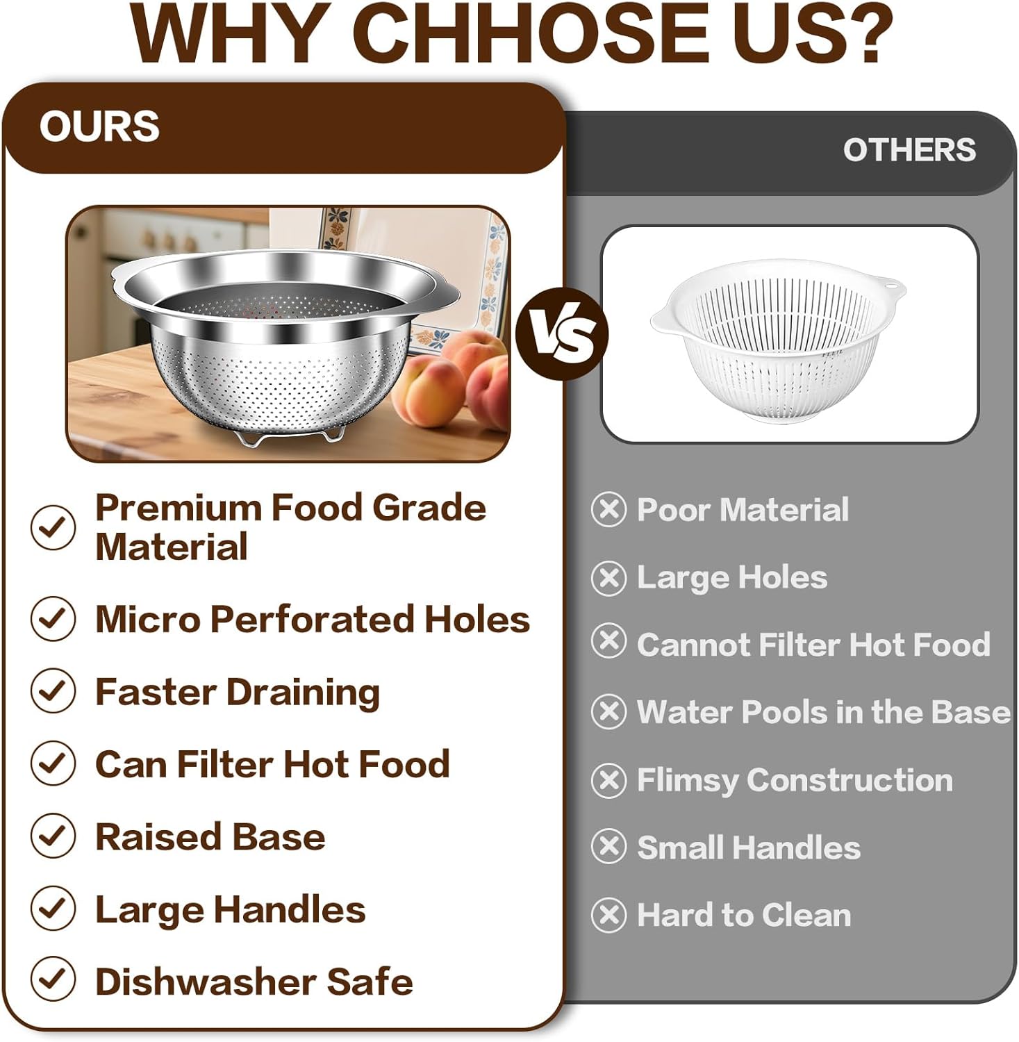 - [Quick-Drain & Dishwasher Safe] Our colander for kitchen has hundreds of precision holes that drain water in seconds - no shaking or waiting! The food-grade stainless steel resists stains, odors, and high temps (suitable for hot foods). Plus, it’s dishwasher-safe. Great for busy families or meal-prep enthusiasts who value speed and hygiene.