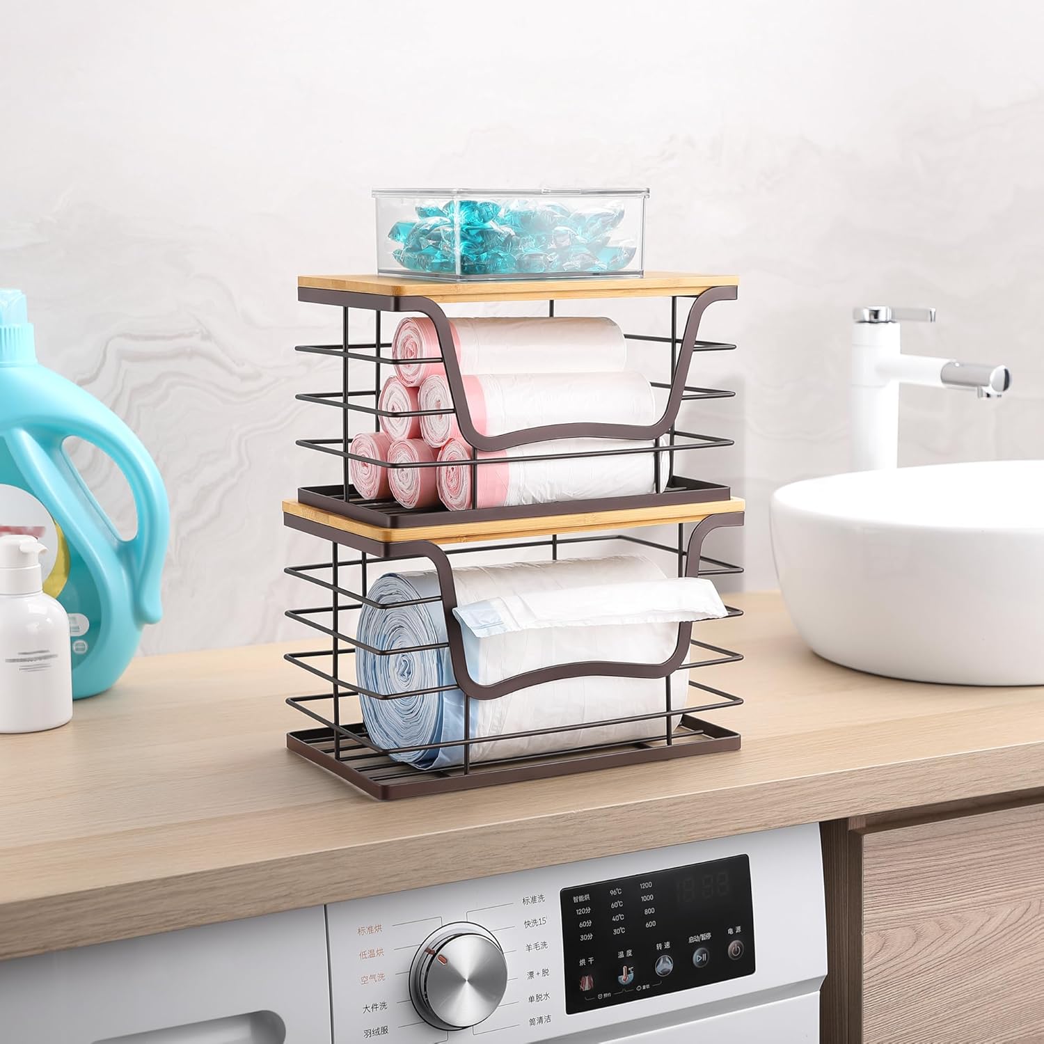 - Easy to Use & Extra Storage. Both dispensers feature wide openings for quick and easy trash bag access. The removable bamboo lids double as shelves for extra storage, allowing you to clearly see and easily reach the items inside—no assembly required, making organization effortless.