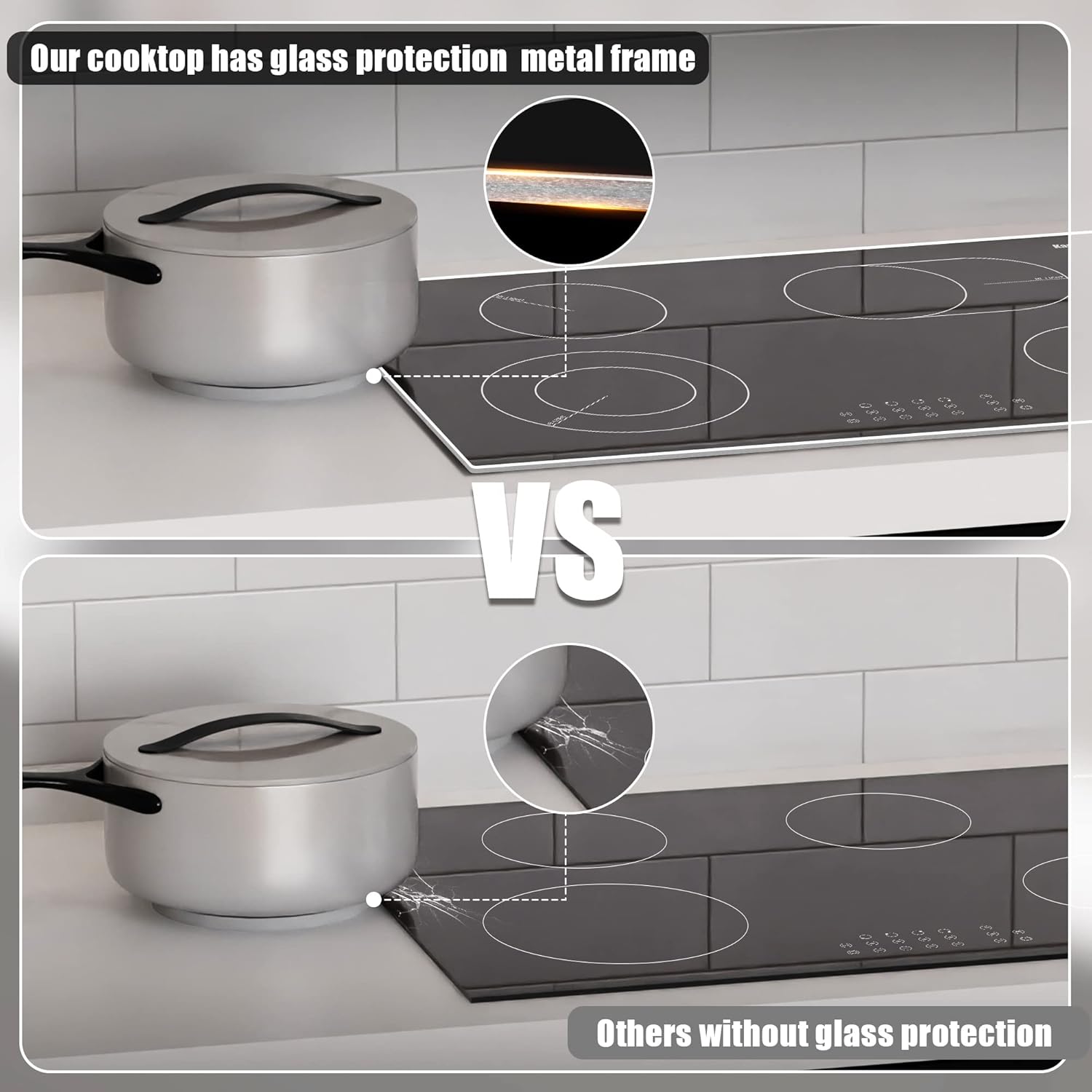 - 【 Glass Protection Metal Frame】During the cooking process, our cookware will often accidentally touch the edge of the 30'' electric cooktop, which can easily lead to broken glass. But our glass electric cooktop is different from other 30'' electric stoves, it is surrounded by metal frame around the edge, which can protect the glass from being bumped, and the whole glass cooktop looks more stylish.