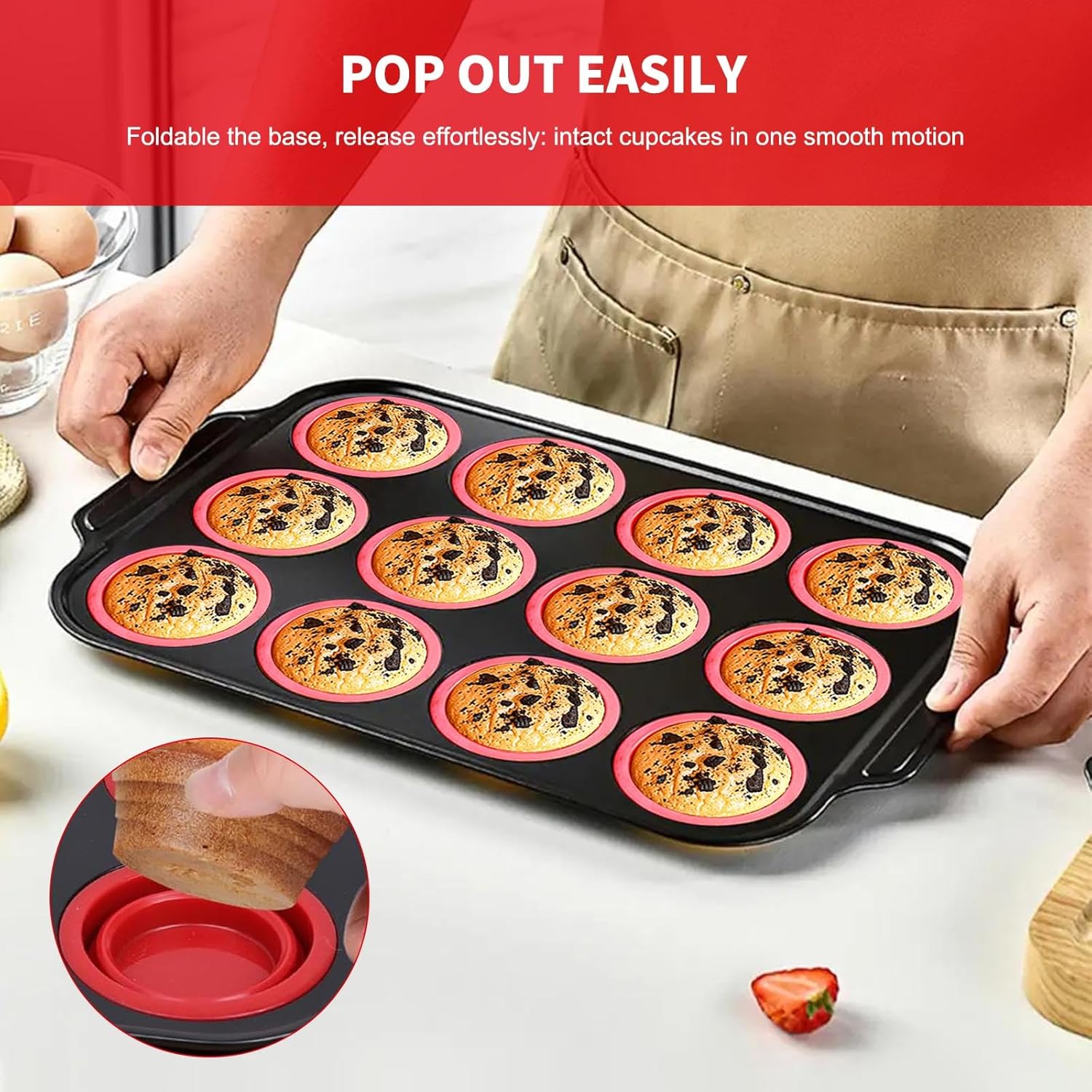 - POP OUT EASILY - With silicone muffin cups, you don't need to push up one by one from the bottom, just press down on all the muffin for 1 second to pop out, and they won't stick together!
