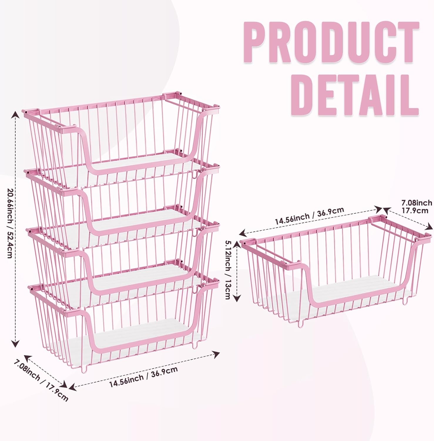 - (LARGE CAPACITY HOLLOW BASKET):Each basket measures 14.57"L * 7.09"W *5.12"H.When stacked, the combined dimensions of 4 baskets are 14.57"L * 7.09"W *20.67"H.The hollow metal basket allows air circulation,keeping fruits and vegetables fresh and tasty with a longer shelf life. It features a U-shaped design for easy access to items and raised openings to prevent items from falling.Perfectly designed for pantry organizers and storage.Stackable”, ‘Breathable Mesh’, ‘Vertical Space’, ‘Modern Simplicity’, etc., space management specialists tailored for modern life.