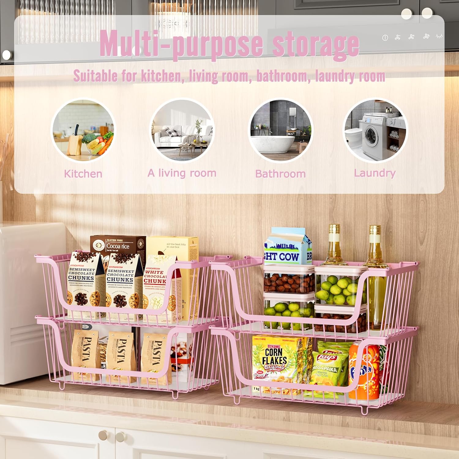 - (MULTIFUNCTIONAL STORAGE):4-Pack wire storage baskets are suitable for kitchen,pantry,living room,bathroom etc.Whether you're looking to keep your kitchen organized,tidy up your pantry bin,our metal baskets will help.Use them on your kitchen as a food basket to store potatoes,onions storage,fruits,vegetables,Steak,spice jars ,can and more. The open design allows for easy visibility and accessibility.In your pantry storage,these stackable pantry bins will keep snacks and goods neatly arranged,catering to all your organizational needs.
