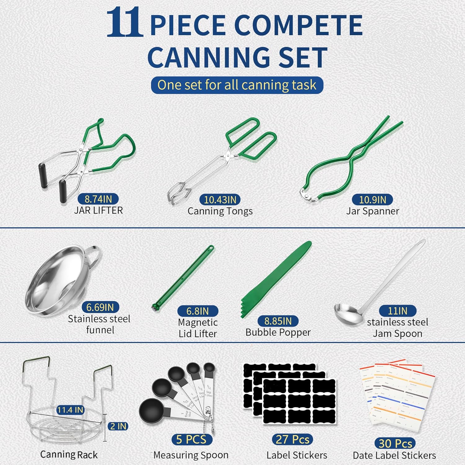- 【All-in-one Canning Kit for Beginners】: We have a stainless steel steamer rack, a stainless steel canning funnel, a canning tongs, a jar wrench, a mason jar lifter, a bubble popper, a magnetic lid lifter for canning, 5-in-1 measuring spoon, a stainless steel ladle and canning labels. The perfect canning starter kit for beginners is a good helper for you to make various cans.(Mason jars not included)