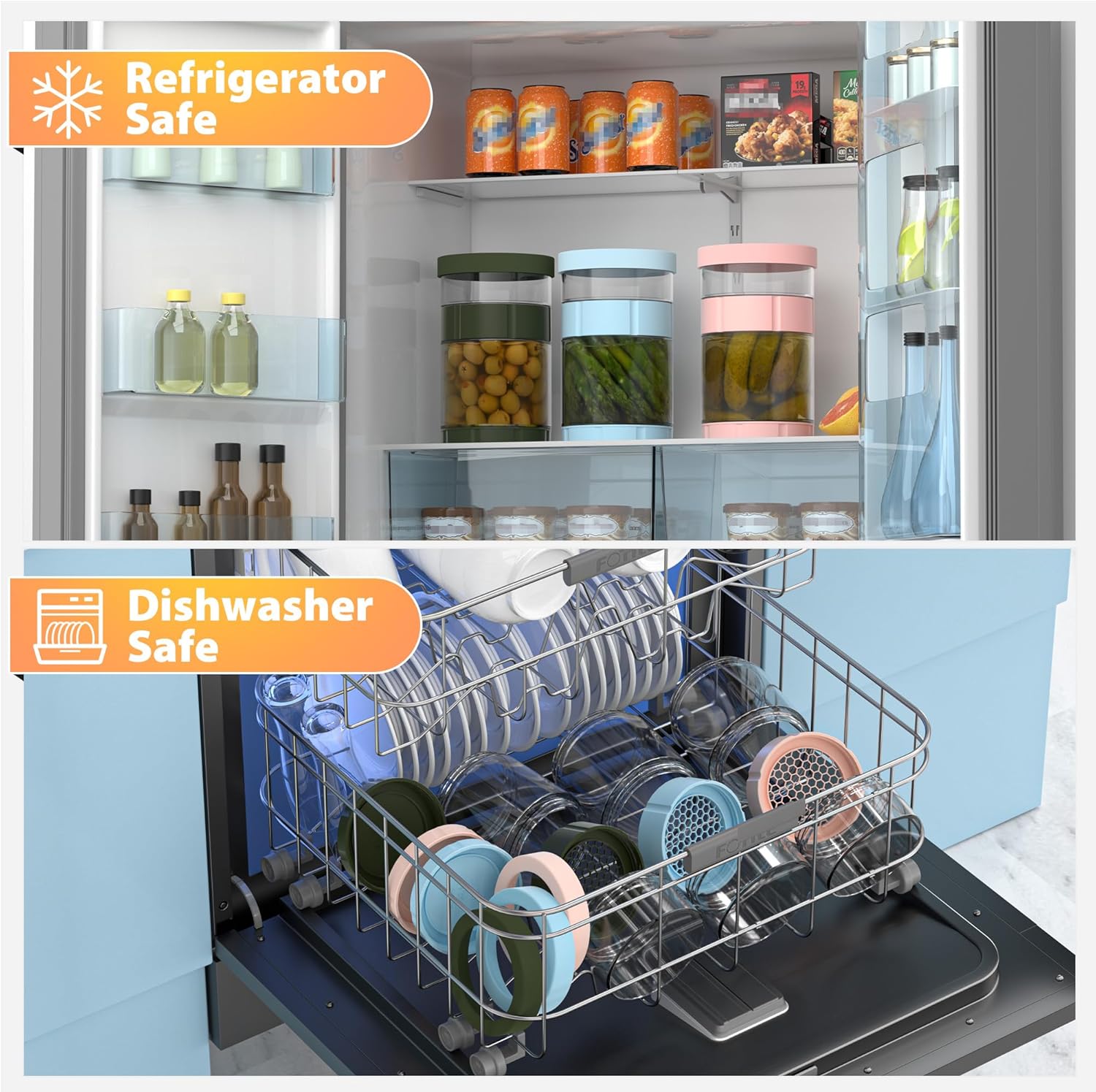 - LEAK-PROOF & NON-SLIP DESIGN: The lid and strainer are equipped with food-grade sealing silicone rings to ensure premium airtightness and leak-proofness. The bottom of the pickling jars comes with a soft, non-slip silicone sleeve, which allows the pickle container to be placed securely, safe for use on the tabletop, in the refrigerator or the cabinet, and will not slide easily