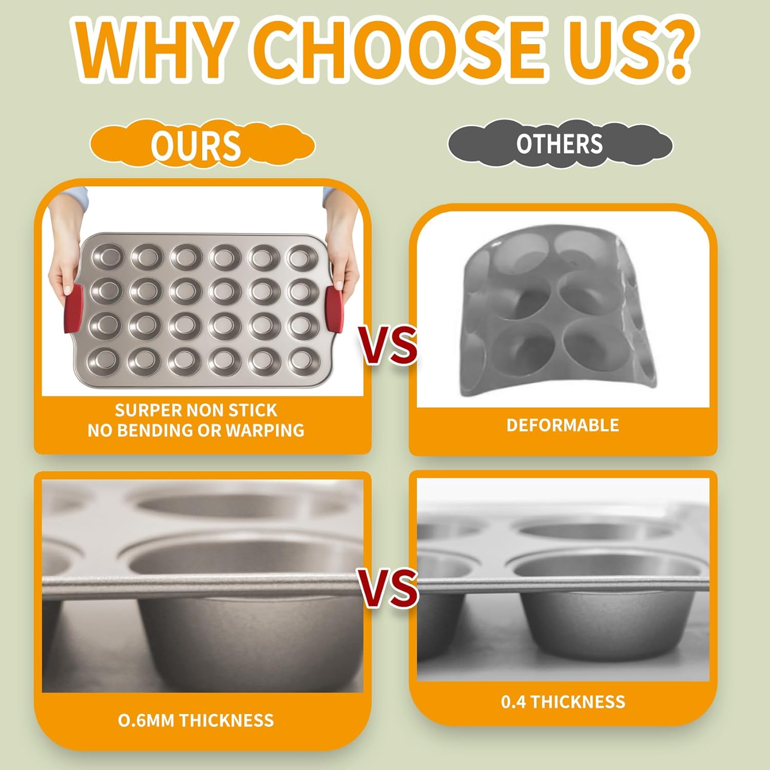 - Easy Grap with Silicone Handles - This muffin cupcake tin features ergonomic silicone grips on both handles, providing a comfortable and secure hold. These grips make it easier to place in and take out of the oven, ensuring safe and convenient handling.