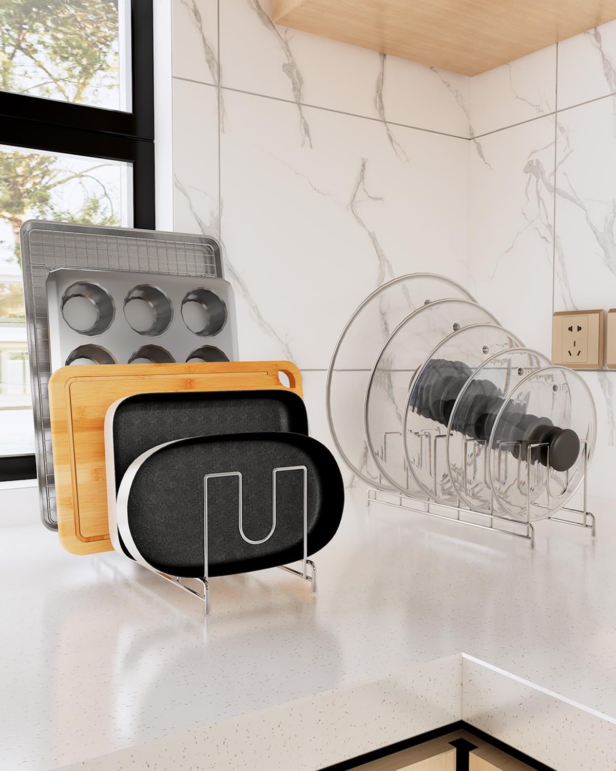 - VERSATILE STORAGE: Set of 2 sturdy pot lid organizers perfect for organizing and storing pan lids, cutting boards, and bakeware in kitchen cabinets or countertops