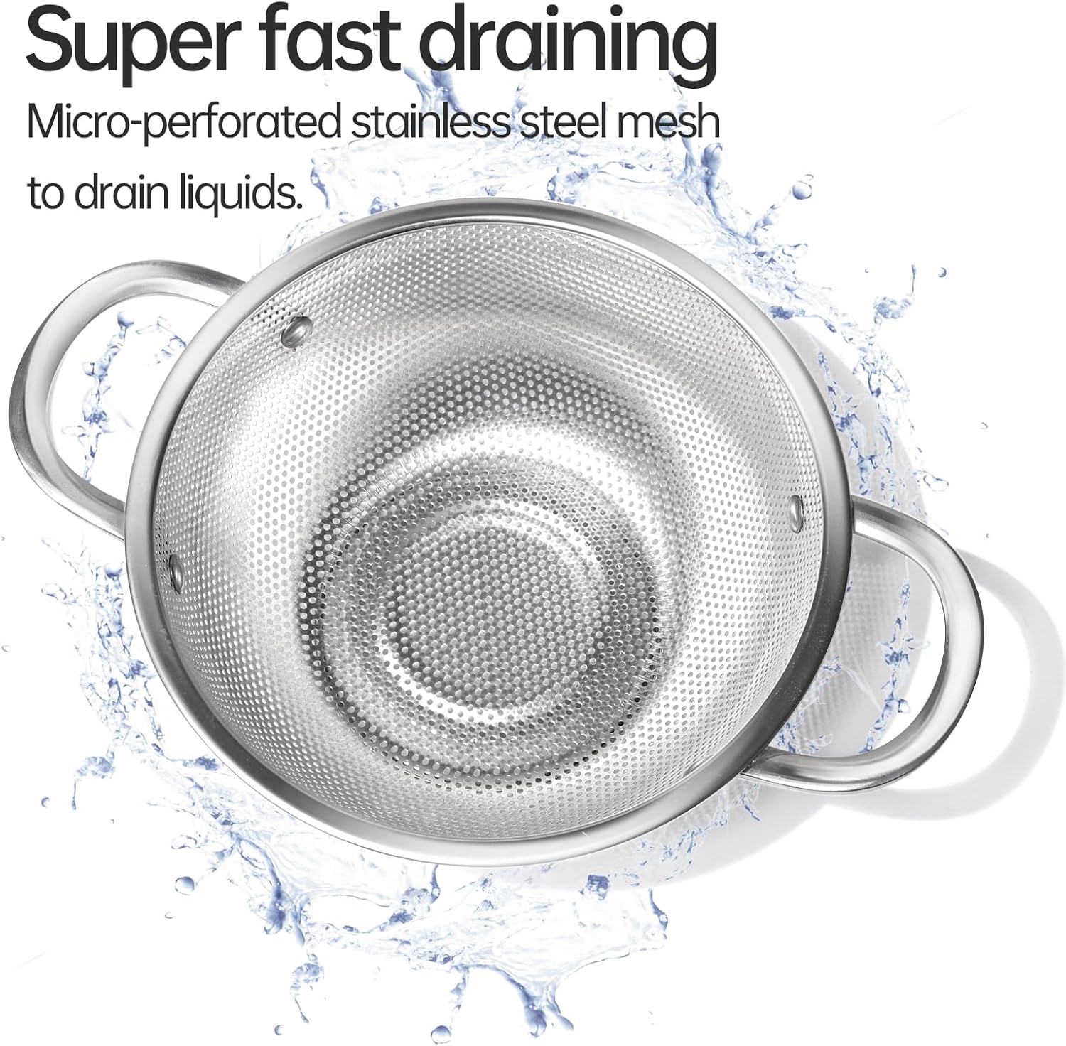 - 【Ergonomic & User - Friendly】Both items come with ergonomic, wide, riveted handles for a comfortable and secure grip, whether lifting heavy pots or handling lighter tasks. The elevated feet on the strainer protect countertops.