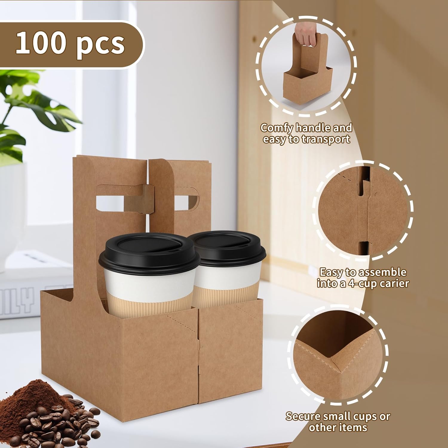 100 Pcs Coffee Drink Carrier with Handle (12-30oz) 2 Cups or 4 Cups,Disposable Paperboard Cup Holder with Handle,Disposable Cup Holders for Drinks,Great for All Your Drink and Food Delivery
