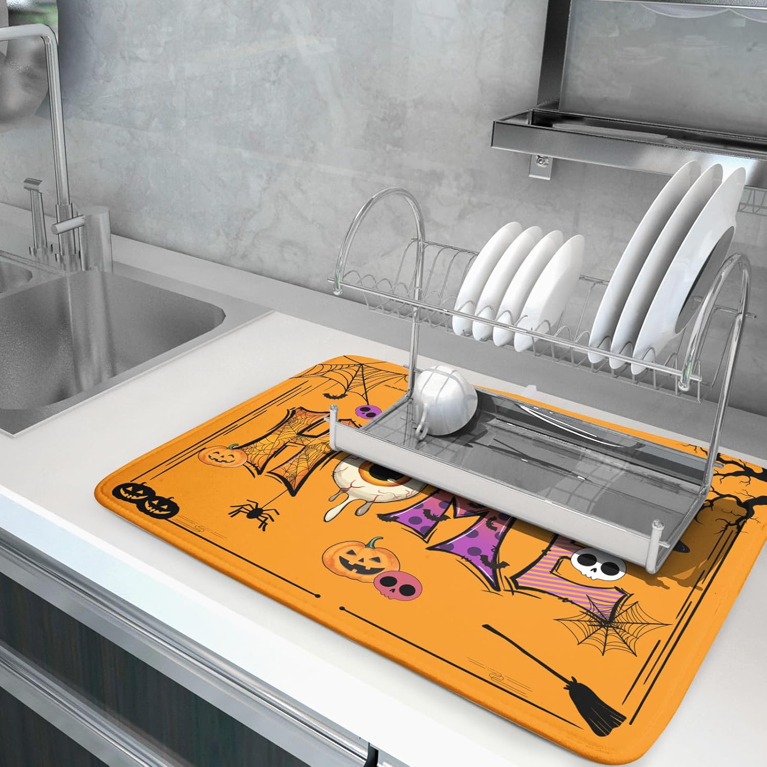 Halloween Home Dish Drying Mat Orange Washable Microfiber Drying Pad for Holiday Decoration